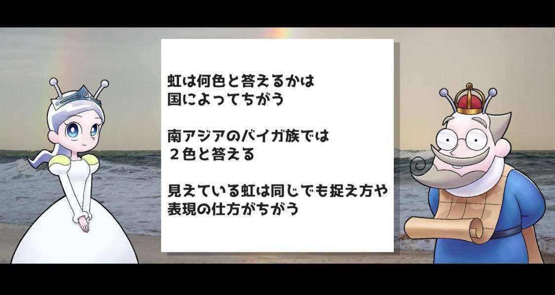 [番組内画面:虹の色の捉え方の違いについて解説しています]
