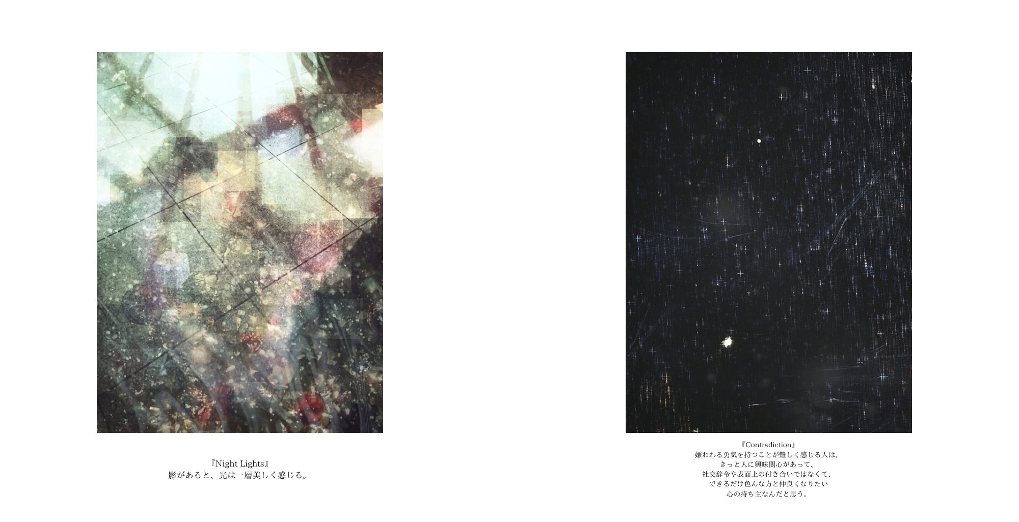 日常に潜む小さな幸せは見過ごしやすいものですが、それを発見できたときに、自然と感謝の気持ちが芽生えては、縁する人に対して優しい気持ちで接することができます。その温かみのある言動に触れた人は、また次の人へ拡がっていく。まるで水面に波紋を描くように、とってもヘルシーで良い循環がめぐる。この作品集が沢山の人を優しい気持ちにさせてくれる一冊となることを望んでいます。