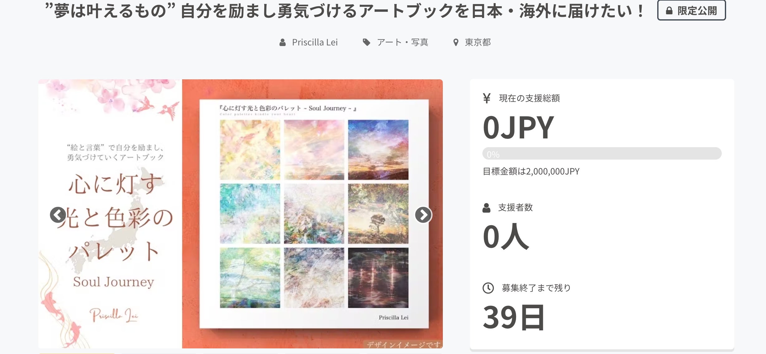 2023/05/08 12:51アーティスト Priscilla Lei(プリちゃん)です。GWいかがお過ごしでしたか??何度かお知らせさせていただいたように、アートブック第二弾『心に灯す光と色彩のパレット ~ Soul Journey~ 』の出版実現に向けたクラファンに挑戦しています。「日本一周をしている最中に、47都道府県の風土を五感で感じて産まれた新作アートたち」と、「旅先でリアルに感じた浮き沈みのある感情体験から紡いできたメッセージ」を掲載する、「絵と言葉で自分を励まし、勇気づけるアートブック第二弾」。ただし、今回も【ALL or Nothing】という、出版実現 or 募集期間までに目標金額に対して一円でも足りなければ、”全額ご返金”という覚悟がいるチャレンジをしています。初日から繋がりある方々に応援していただいて、現在【63%】まで到達。でも、100%を達成しないとダメなんです。今すでに140人もの方々から応援していただいているので、その方々のためにも叶えたい。—–(2023年5月8日 12時現在)—–目標:200万円支援総額:1,270,585円(63%達成)支援者数:142人募集終了まで:2日———————————————***私は2022年に、学生時代(約10年前)の夢の一つでもあった日本一周を実践し、旅先で出会う人や、SNSなどオンラインで繋がりのある皆さんに支えられて達成。思い描く夢や目標が、今すぐには叶えられなかったとしても、叶えられるまで温め続けることで、一番適したタイミングで叶えることができる。自分で自分の可能性を諦めずに、信じ続けてみること。叶えるためのアクションを、叶えるまで積み重ねていくこと。そのことを、またとない日本一周の体験を通して、一番学ばさせていただきました。“どこまでも周りではなく、自分次第で状況も環境も変えていくことができる。”と。***【あと残り2日(5/10(水) 23:59まで)】で結果が決まってしまいます。。!新刊のアートブックを届けたい気持ちはもちろんですが、、何よりもこのプロジェクトやアートブックを通して、”Never give up (=自分で自分の可能性を諦めないで)というメッセージを一番届けたいです。なので、私も最後の最後まで諦めることはしませんよ。。。!なぜなら、結果は最後までやってみないとわからないからです。アートブック以外にも沢山のリターンがありますので、ぜひ今一度プロジェクトページをご覧いただけると嬉しいです。☆★“夢は叶えるもの” 自分を励まし勇気づけるアートブックを日本・海外に届けたい!★☆(あと37%集まれば、100%サクセス)◉プリちゃんを応援したい方は、こちら◉https://camp-fire.jp/projects/view/663941【ご支援の締切は、5月10日(水) 23:59までです。】Priscilla Leiプリちゃん もっと見る