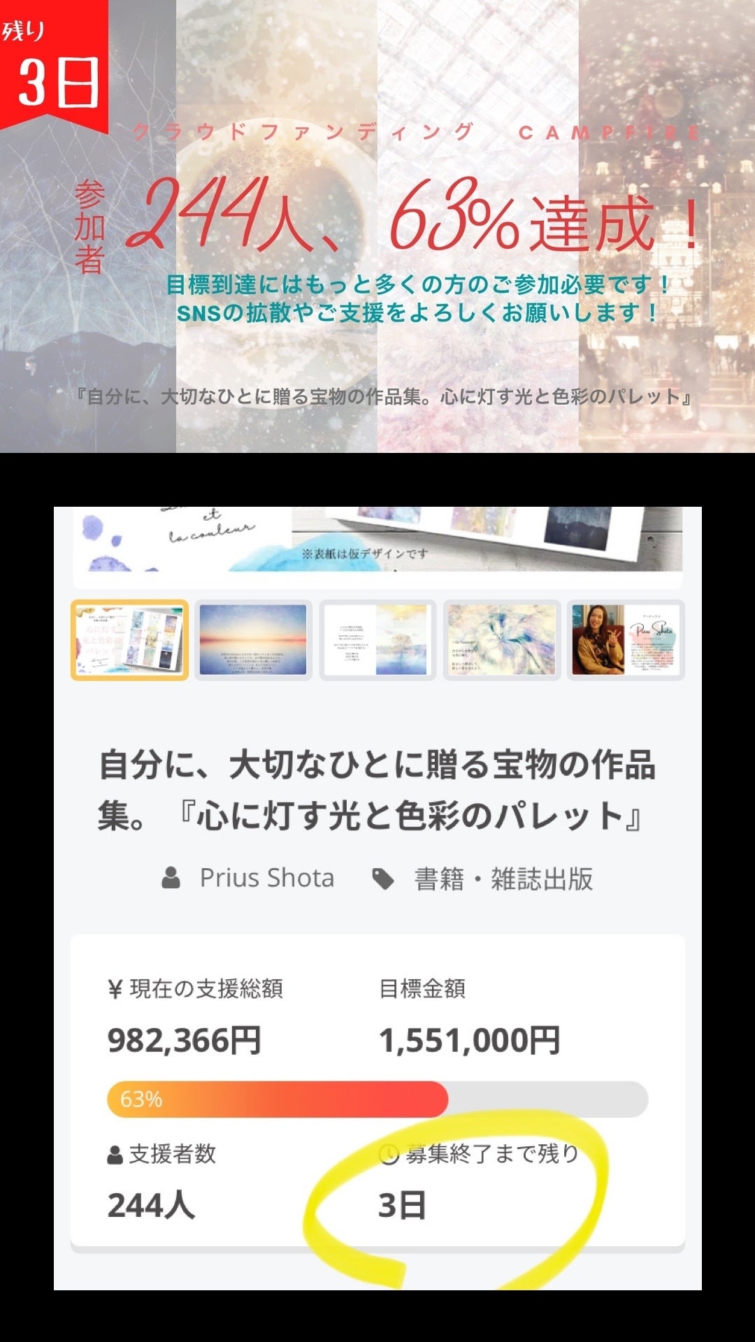 【自分に、大切な人に贈る宝物の作品集。心に灯す光と色彩のパレット】の出版クラファン。早いもので、残り3日となりました。。!
