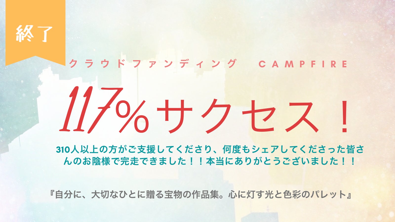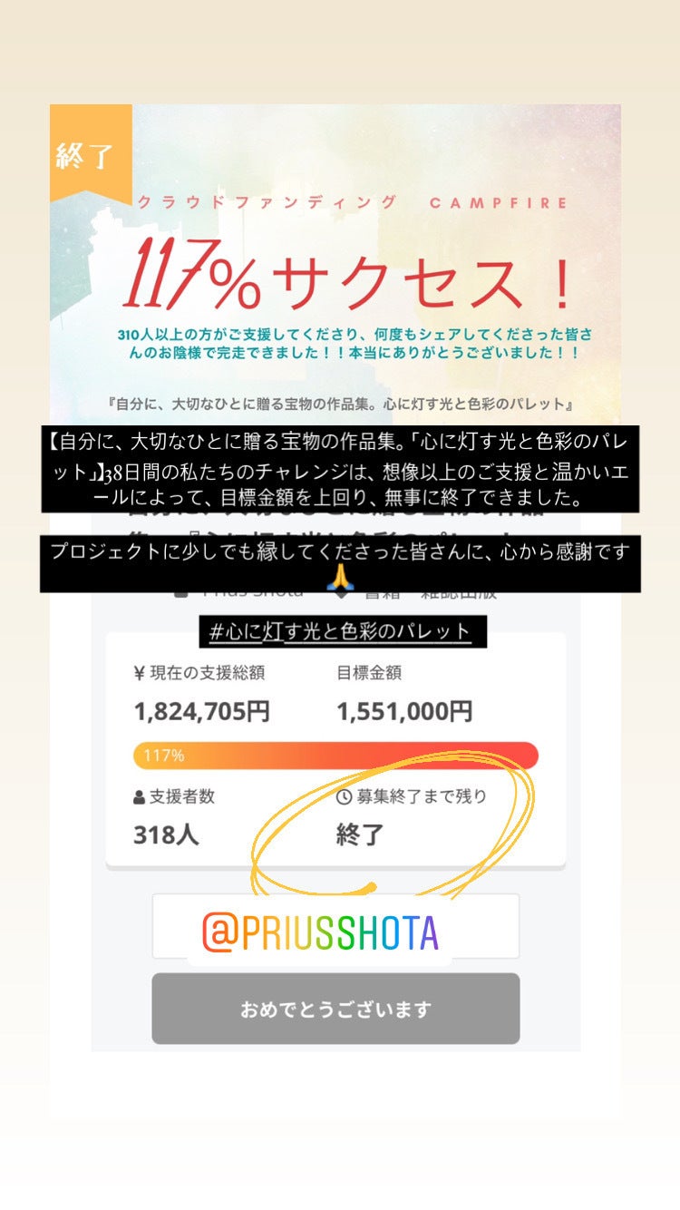 最後の最後まで駆け込み支援があり、#光と色彩のお裾分け というSNSシェアの波も起こり、最後はTwitterのスペースで一緒に期限終了まで温かく見守ってくださる方も現れたりと、沢山の優しさをクラファン終了までありがとうございました。。!