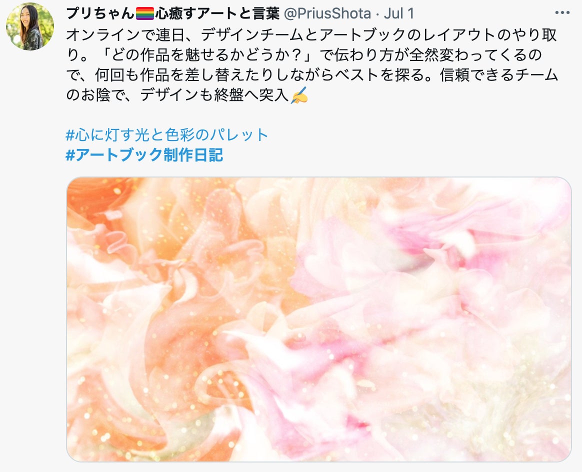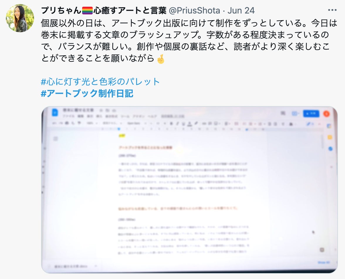 この期間、アートブックの巻末に載せるおまけページ、「アートブックを作る背景」「心に灯す光と色彩のパレットが生まれたきっかけ」「個展の裏話」といった、プリちゃんのことがより深く知ることのできる文章たちを推考していました。