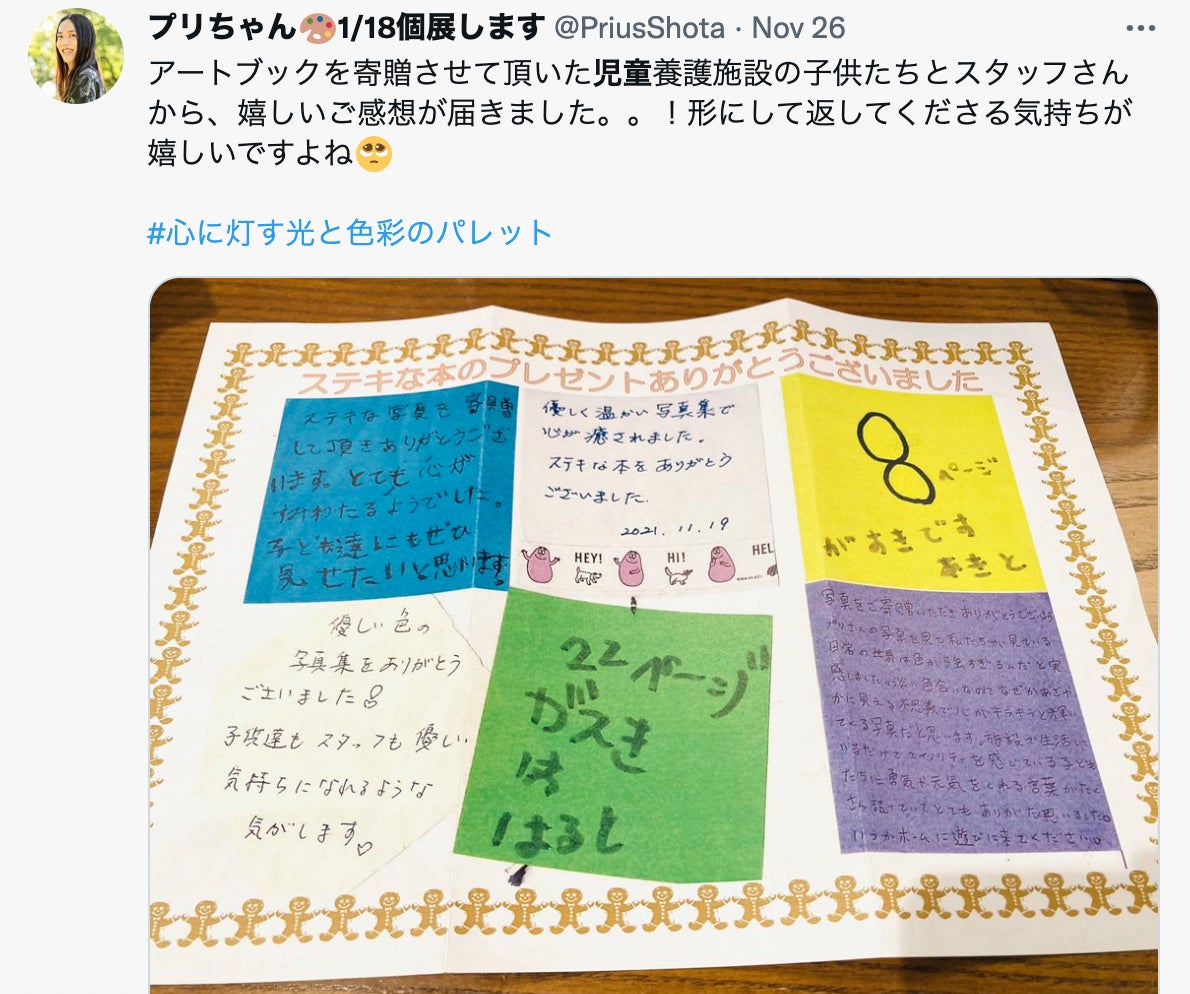 12/20現在、【1000部刷ったうちの、残り420冊】となり、想像以上に沢山の方々の元へアートブックをお届けすることができました。その内の100冊は、児童養護施設や就労支援施設といった社会福祉施設へ寄贈もさせて頂くこともできました。また、銀座 蔦屋書店さんなど、お取り扱いをしてくださる店舗様ともご縁を結ぶことができ、書店経由でアートブックを手にしてくださった方もいます。