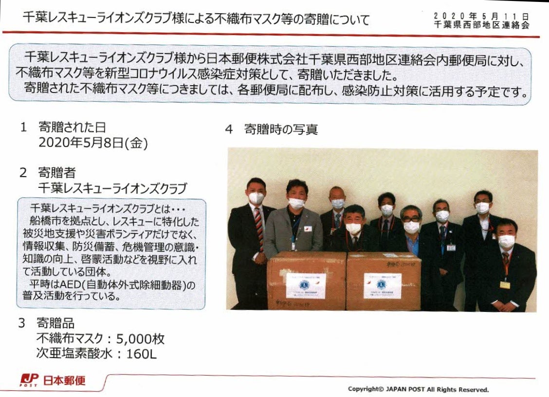 2022/09/16 19:15シトラスリボンプロジェクトの完結のお知らせ!2021年6月に本クラウドファンディングは終了致しました。ご協力頂きました皆様におかれましては、心より御礼申し上げますm(__)m世の中は当時と比べ、幾分、「コロナ」と言うものが何か?という事が時間と共に分かって来た気がします。その中で対策をし、経済活動を回しながら今の生活があると思います。現在も感染者が多く出る中で、終息迄の兆しが見えないのが現状です。皆様がこれからも健康・ご多幸でありますことを、当クラブ一員は祈念しております!さて、本プロジェクトの頂きましたご支援に付きまして、ご報告させて頂きます。活動に付きましては2つの支援をさせて頂きました!➀2021年9月 船橋市へ200個のパルスオキシメーターの寄贈!この時期は自宅療養者が増え、「パルスオキシメータが不足している」と船橋市よりお話を受け、200個の機器を入手!このプロジェクトでの寄贈である事も分かる様に、ストラップを付けて船橋市の市長の松戸市長へ直接お渡しをさせていただきました!②2022年8月 鎌ケ谷市公立の小中学校へ525本の手指消毒液の寄贈! 市川市、八千代市の幼稚園3園へ25本の手指消毒液の寄贈!北海道日本ハムファイターズとのコラボにより、鎌ケ谷スタジアムにて寄贈式を行いました!船橋市の周りを見渡しますと、状況は一変し、支援金や支援物資はなかなか届かない事が分かりました。そこで、鎌ケ谷市の公立全小中学校の各教室に、このカビーのキャラクターをモチーフにした、手指消毒液を寄贈させて頂きました!以上が、本プロジェクトによる活動報告となります!最後に、本プロジェクトへご協力とご理解を頂きました皆様に重ねて御礼申し上げますm(__)mそしてこのプロジェクトを成功させる為にご協力頂きました『ふなっしー』にも、この場をお借りして御礼申し上げますm(__)m更に、寄贈品にあたりご協力頂きました『北海道日本ハムファイターズ』の皆様にも御礼申し上げますm(__)m本当に皆様のご協力無くして、この様な活動は出来ませんでした!心より御礼申し上げますm(__)m今後もまた困っている人の為に、「できることを できる人が できるだけやる」精神で活動して参ります!是非、またの機会にもご賛同とご協力を賜りますようお願い申し上げますm(__)mこの度はご協力、どうもありがとうございましたm(__)m 千葉レスキューライオンズクラブ一同 もっと見る
