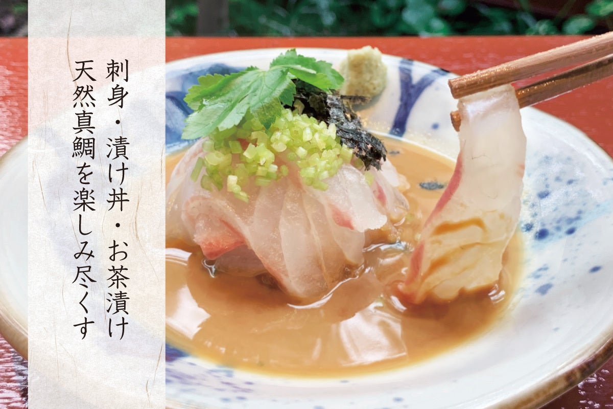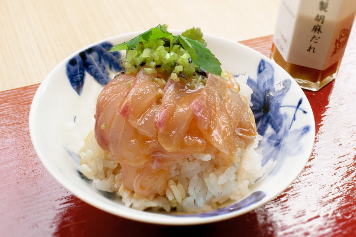 盛り付けた鯛のまわりには、たっぷりの胡麻だれ。最初はお刺身で、次に漬け丼、最後にお茶漬け、どの食べ方でも真鯛を美味しく食べていただけるように試行錯誤をしながら完成させました。