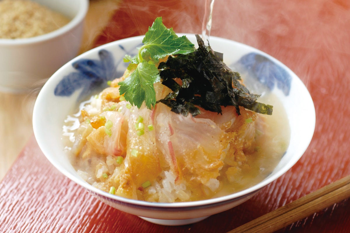 弐で残しておいた鯛をご飯の上にのせ、お茶をそそぎます。