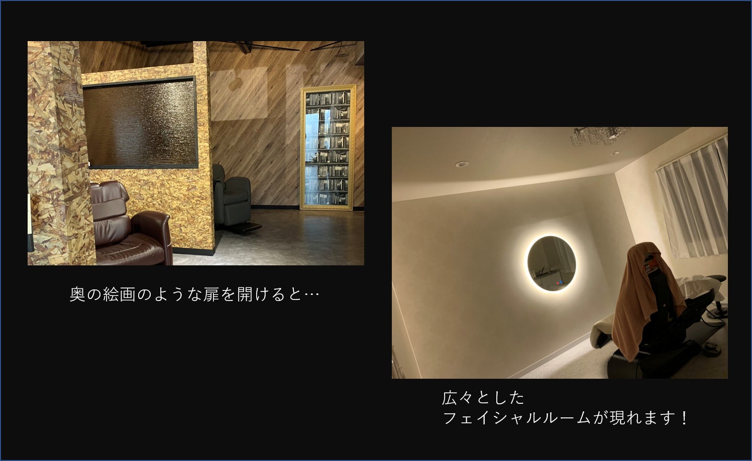 ちょっとした遊び心で、女性専用スペースへの扉を隠し扉風にしてみました。子どものころ、一度はこんな隠し部屋が欲しいと思ったこと、ありませんか?private salon ANNO. にいらしていただければ、隠し扉の向こうにご案内します!