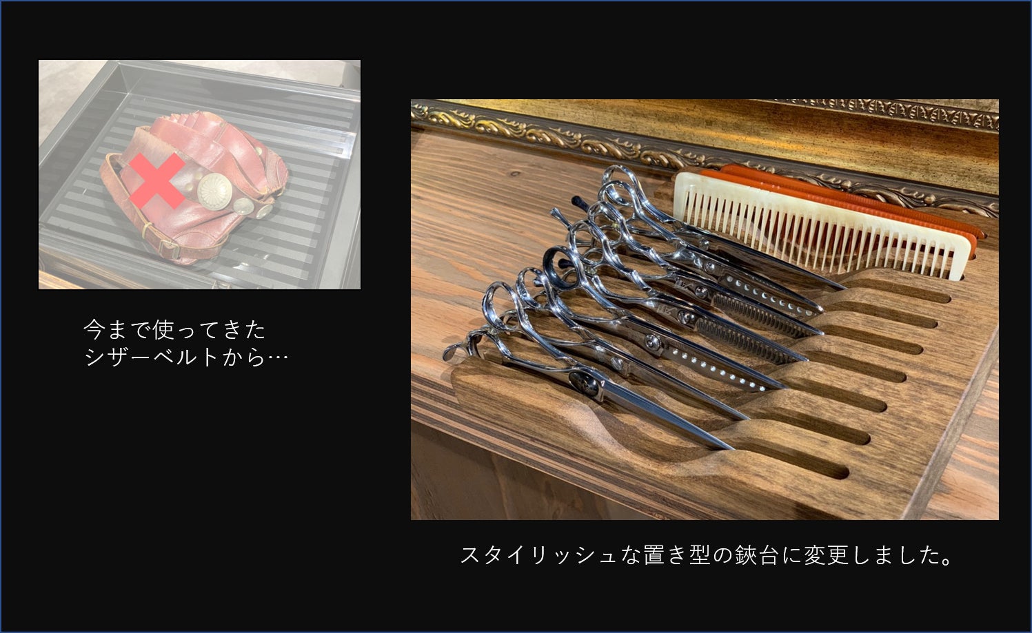 private salon ANNO. では、使う道具にもこだわっています。今までずっと使ってきた革製のシザーベルトから、置き型の鋏台に変更いたしました。置き型だとカットの際の動きがスムーズになりますし、消毒や掃除がしやすいのもメリットです。お客様にもより安心してご利用いただけます。