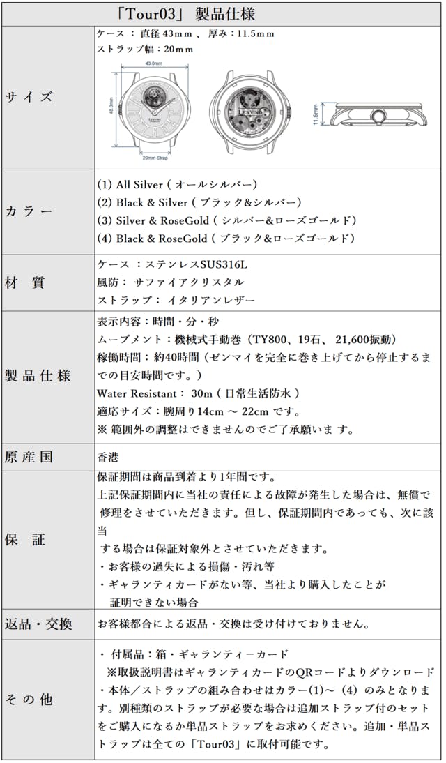 そんな私が香港の小売店で出会ったのが「Tour 03」の前作「Tour 02」になります。あまりの美しさに心を奪われました。「この美しい時計を日本にも広めたい」という想いからCAMPFIRE様を通じて販売を始め、1年で国内累計4000万円以上を売上げるヒット作となりました。「Tour 03」は前作よりデザイン性に優れた商品だと確信しております。ぜひこの機会に本物の逸品をお試しください。