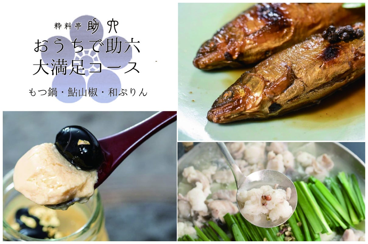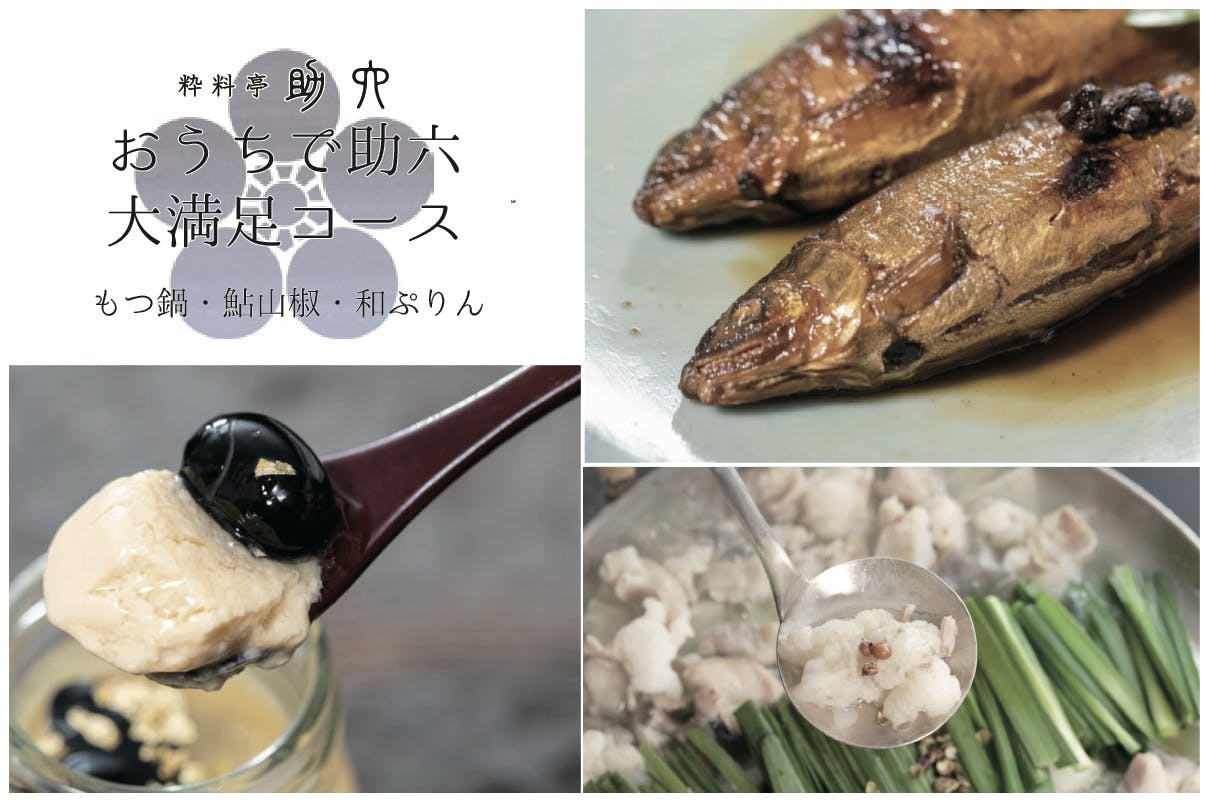 お店には来れないけど、「助六」さんを応援したい。そんなあなたにお取り寄せで大人気、「もつ鍋」と「鮎山椒」と「和プリン」を3種類のセットとお礼のお手紙をお届けします。上記で紹介したもつ鍋、鮎山椒、和プリンの3種類を是非ご堪能ください。