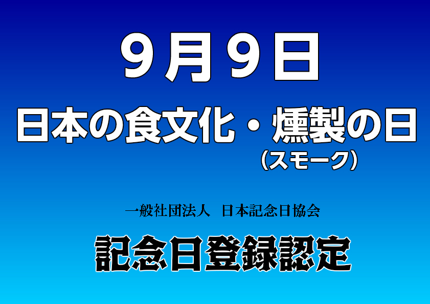 最近キャンプが流行っていますよね!そのカテゴリーの中の「燻製」がブームになってるのご存じデスカ⁉色々な燻製用の道具が販売されております。また燻製専門のカフェやレストランもお目にかかります。それで、私どもは「燻製」をブームで終わらせたくなくとの思いで、「一般社団法人日本記念日協会」の認定を受け9月9日を『日本の食文化・燻製(スモーク)の日』として記念日登録しました。(日にちは燻製を燻す煙をイメージしたモク(9)モク(9))からです!