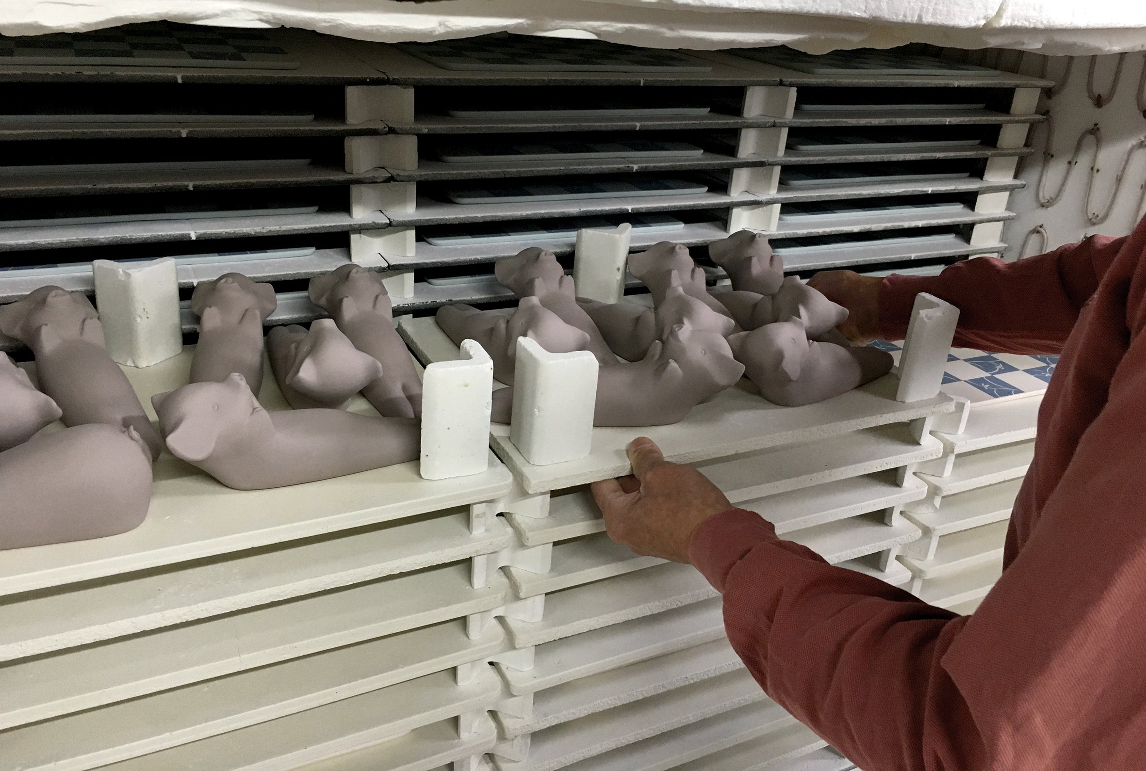 仕上げた生地を電気炉へ窯詰めして1200°の高温で焼き上げます。↓窯の温度が下がってから窯出しします!