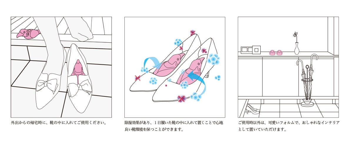 毎日簡単に使える除湿・消臭アイテムです。可愛いネコちゃんを帰宅後に靴の中に入れておくだけで、気になる湿気や臭いを抑えてくれます。抗菌効果もありますので細菌の繁殖を防ぐこともできます。