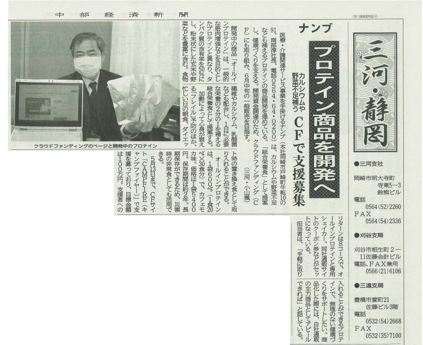 地元新聞「中部経済新聞社」に記事が掲載されました。