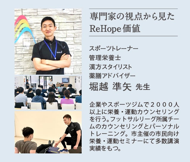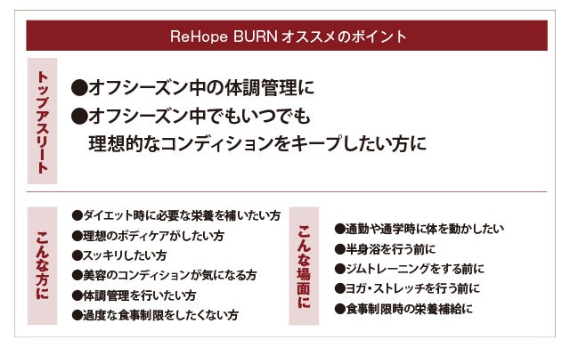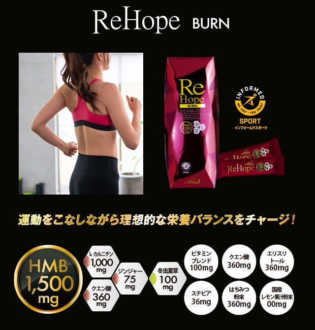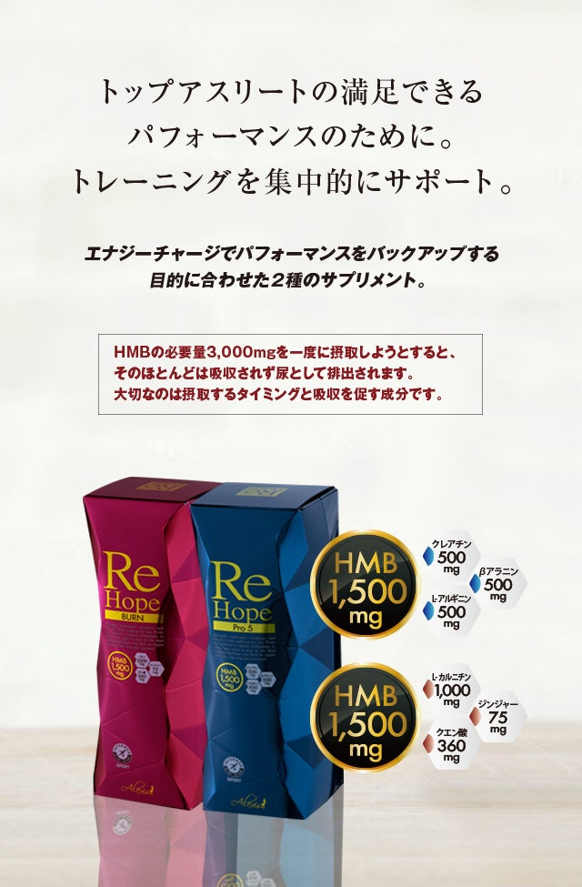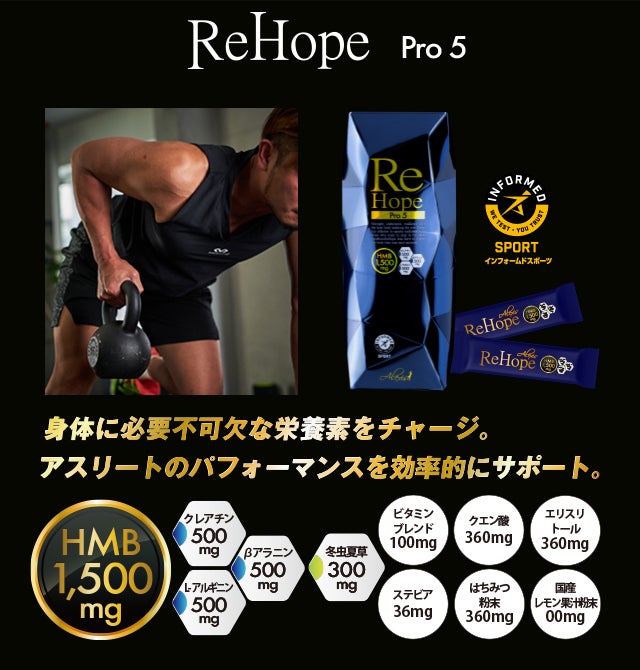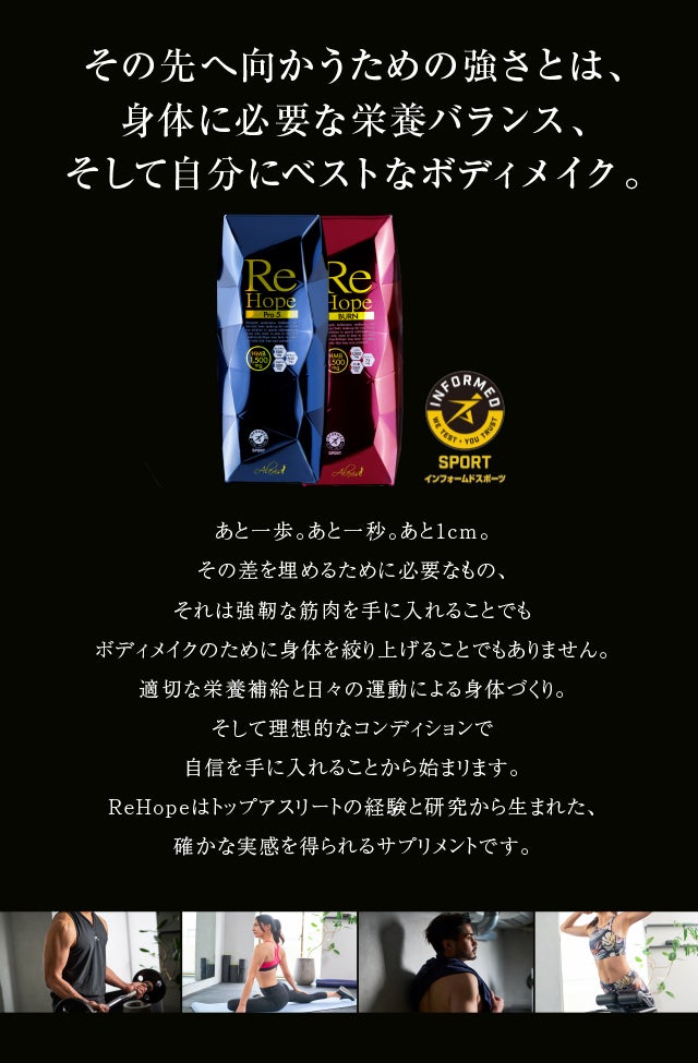 身体に必要な成分をベストなバランスで独自に配合したReHopeは、トップアスリートはもちろん、アマチュアスポーツを楽しむ方、ダイエット時に不足した栄養を補いたい方にお届けしたいサプリメントです。