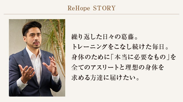 身体にとって最適なのは必要な栄養素を保ちつつ、コンディション維持ができていること。その上で日々のトレーニングに励むこと。それらを実現するために必要な様々な栄養素を追求し、身体に良いとされるあらゆる食品や和漢に至るまで探究を行いました。そしてついにReHopeは生まれたのです。