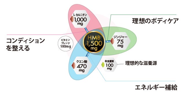 HMBによって身体に必要な栄養を補い、Lカルニチン&ジンジャーによってコンディションを整えます。