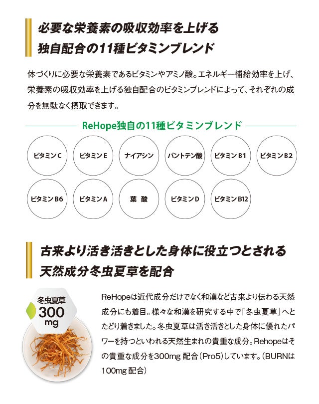適材適所でそれぞれの成分のよさを引き立てるサプリメント、それがReHope Proです。