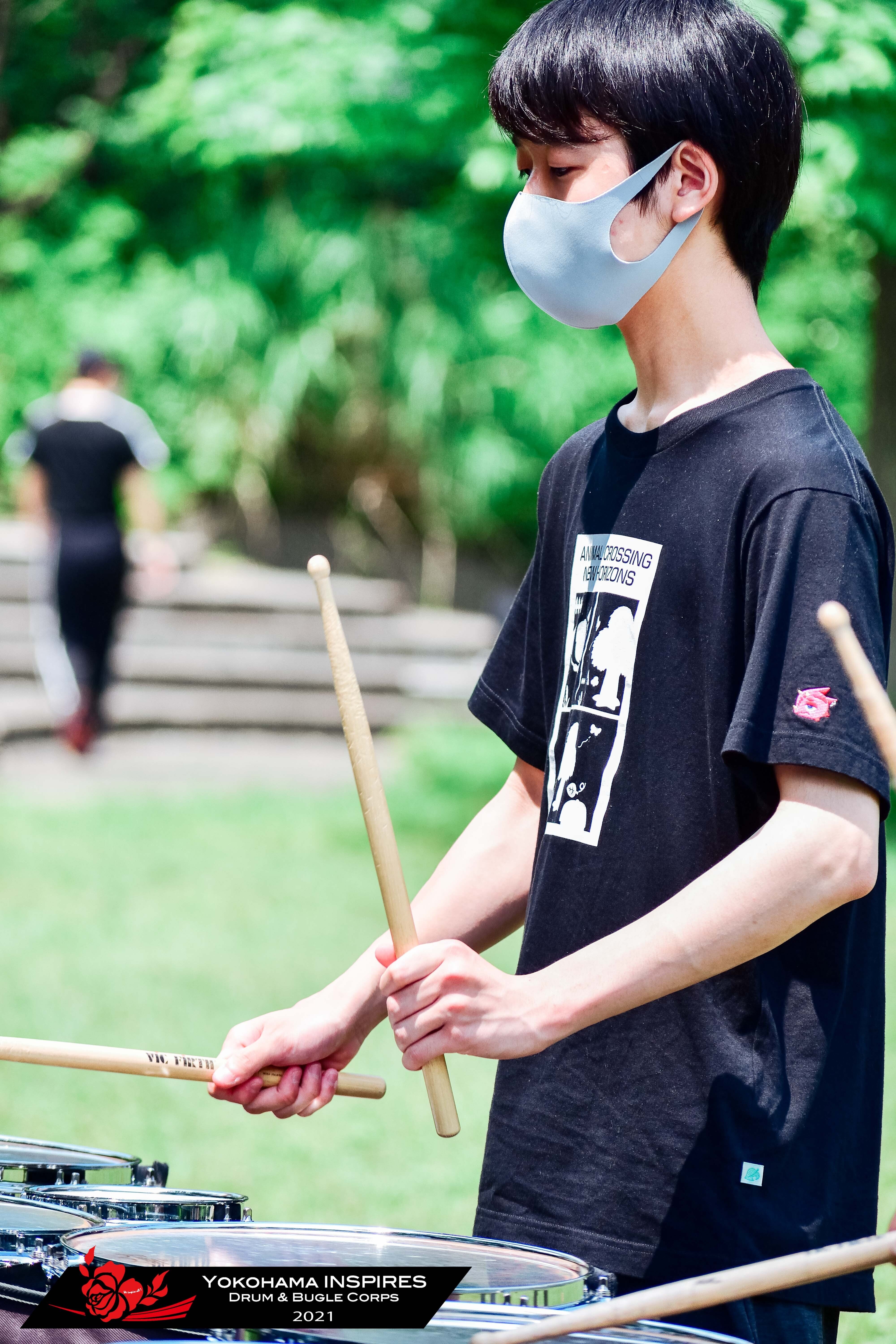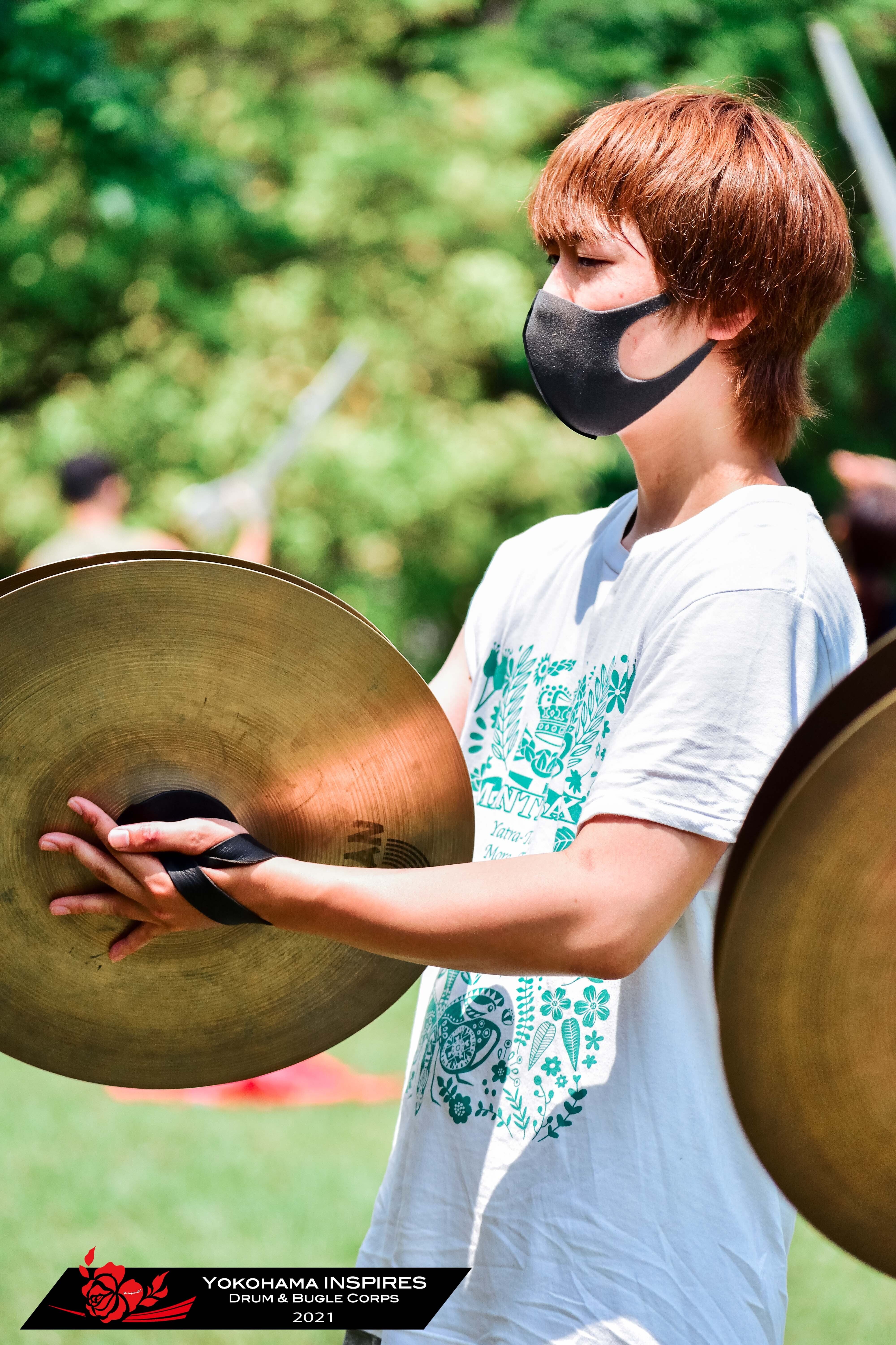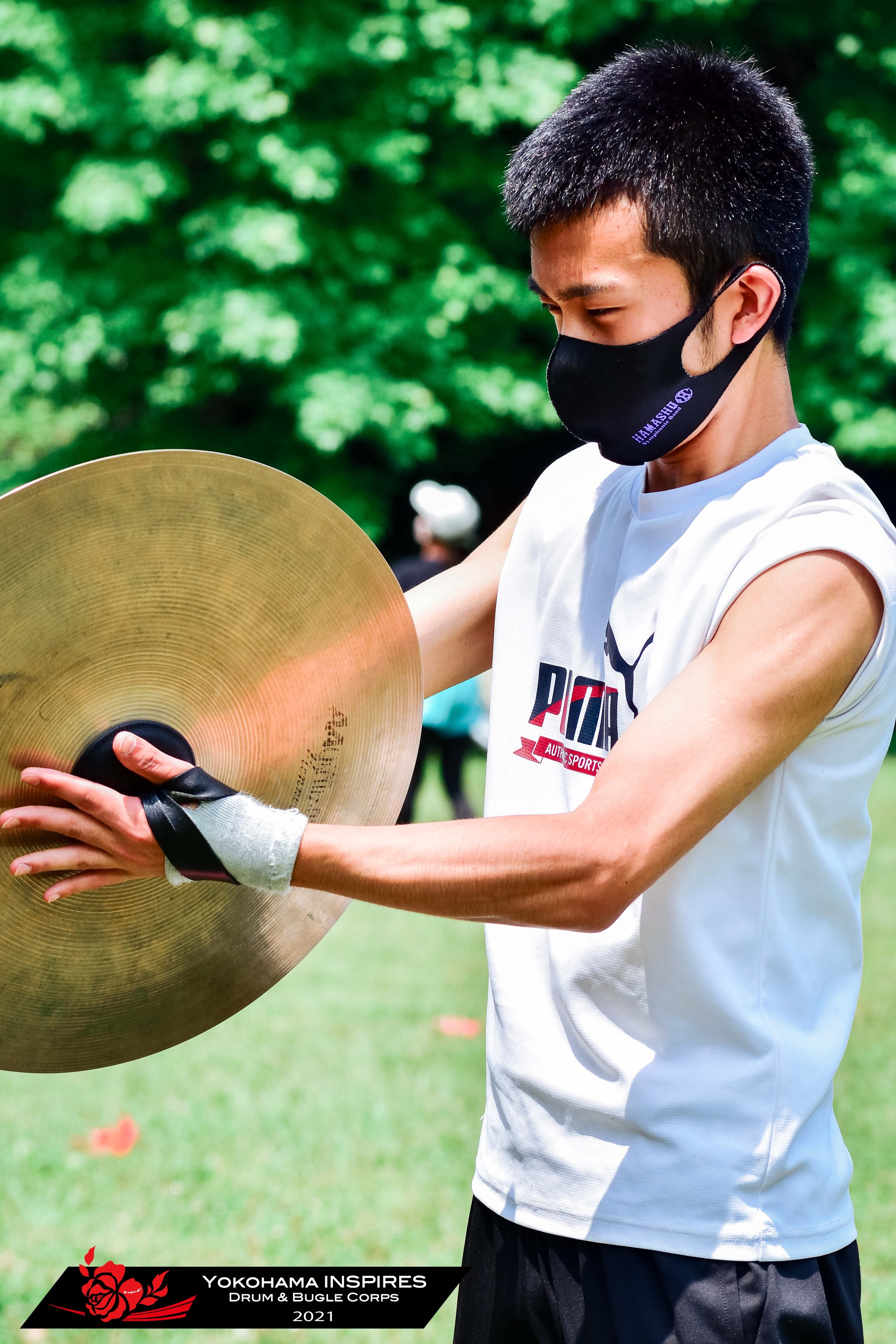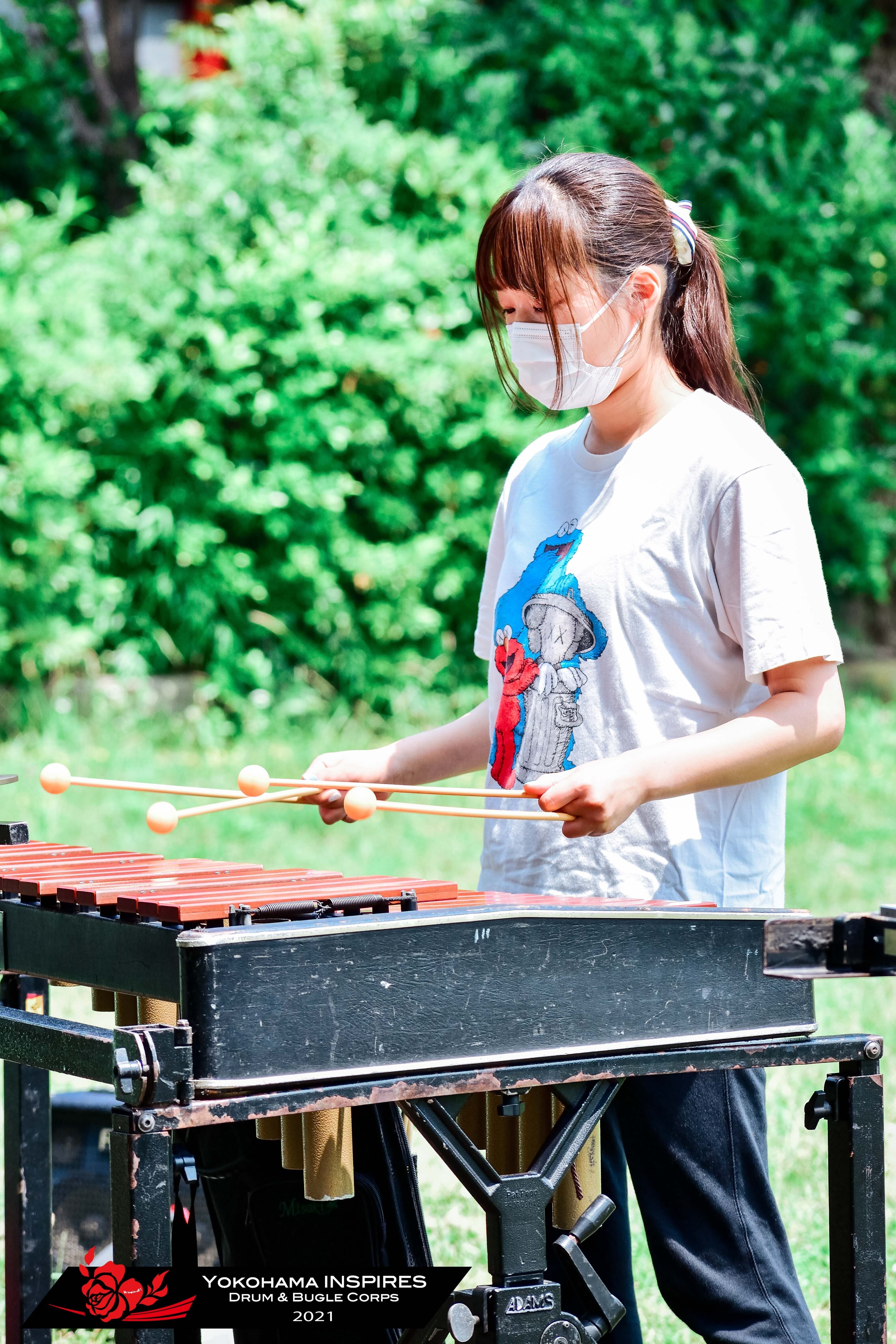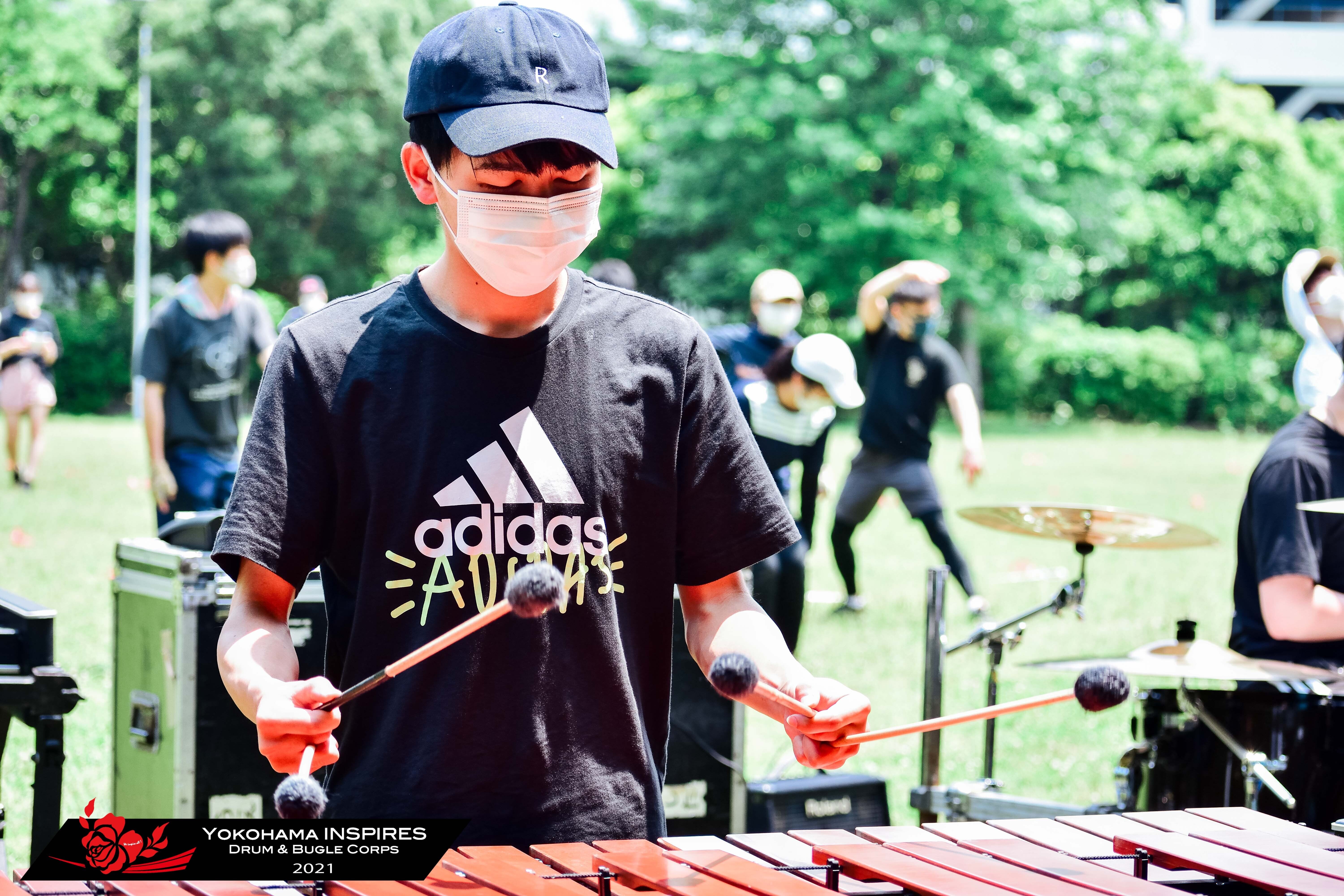 青空と新緑に囲まれ、主にドラム・カラーガードセクションをみてもらいました。