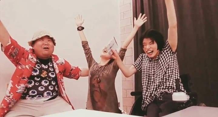 私も悩みました。すばらしい表現力を持っているのにそれを発揮しきれないまなちゃん、対する私は、自分の感情表現の下手さに悩んでいました。セリフは棒読みで、顔の表情がぎこちない、そんな自分がどんどん嫌になっていきました。私に表現活動は無理だ、まなちゃんにも申し訳ない、と落ちこんだときに、友だちの顔が浮かびました。それは福の神そっくりの顔をしたこんちゃんでした。こんちゃんは全盲です。こんちゃんは目が見えないから朗読できないじゃん、そう思いながらも、まなちゃんをリラックスさせてくれると思い、声をかけました。