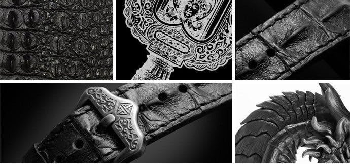 中世の騎士、アーサー王の鎧に影響されたドラゴン仕様のケース、剣の形をした針、この時計を構成する全ての部品を自社で製造しています。(日本製のムーブメント以外)王冠やドラゴンの背骨の形をした革のストラップを使用。また、ゴシック建築を連想させるスケルトン化された文字盤も特徴の一つです。時代を超越したユニークな時計を提供します。
