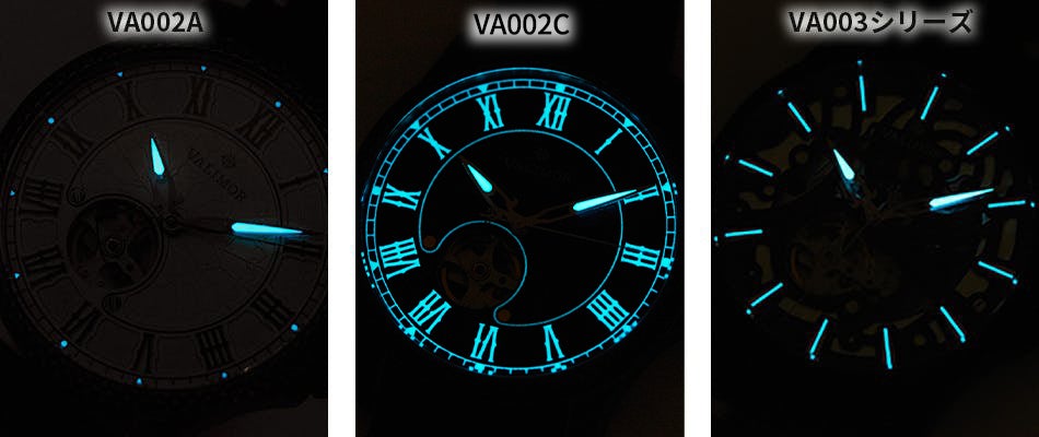 ※VA002Cはローマ数字や針が、VA003シリーズもインデックスや針が光ります。VA002Aの背景色が淡い白色なので、ローマ数字に、代わりに黒のメタルガンカラーをインデックスに塗りました。