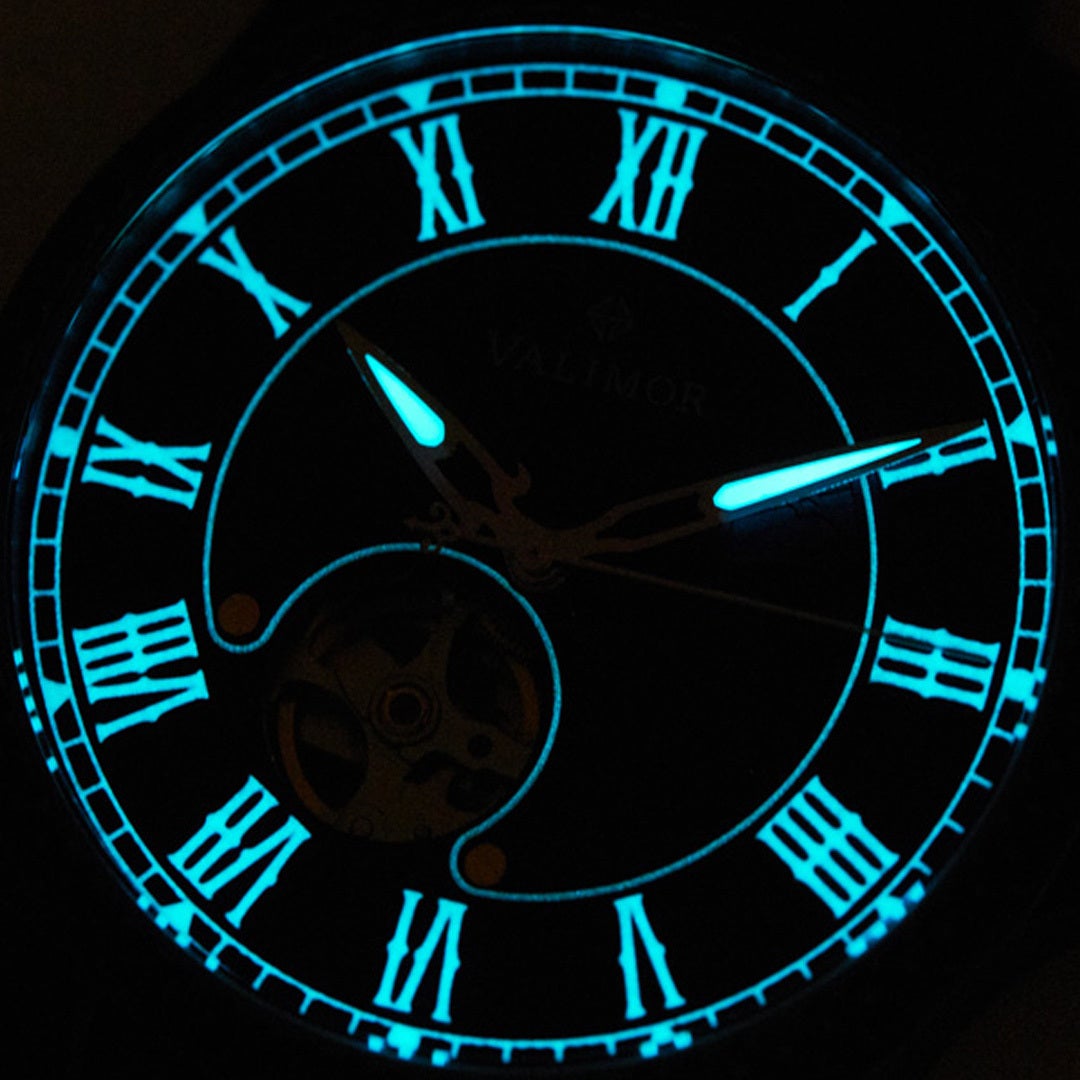 針や文字盤に夜光加工がされている為、暗闇の中で光ります。昼間に太陽の光を吸収し、暗闇の中ではっきりとした青色の光を発します。