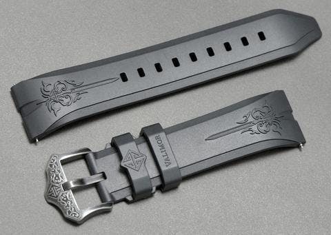 龍の尻尾をイメージしたオリジナルのストラップデザインです。ワニの皮に最先端の技術を用いて、繊細な3Dスキャンをすることで、ワニの皮のような模様を再現しました。この3Dスキャンをもとに、金型を開発し、「ドラゴンレザー」を製作しました。素材は牛革の本革、トップグレインレザー。トップグレインレザーは、耐久性があり、ソフトで高品質な肌感です。すべてのストラップには、剣の柄に影響されたオリジナルのバックルが付いています。細部にまでこだわったストラップです。