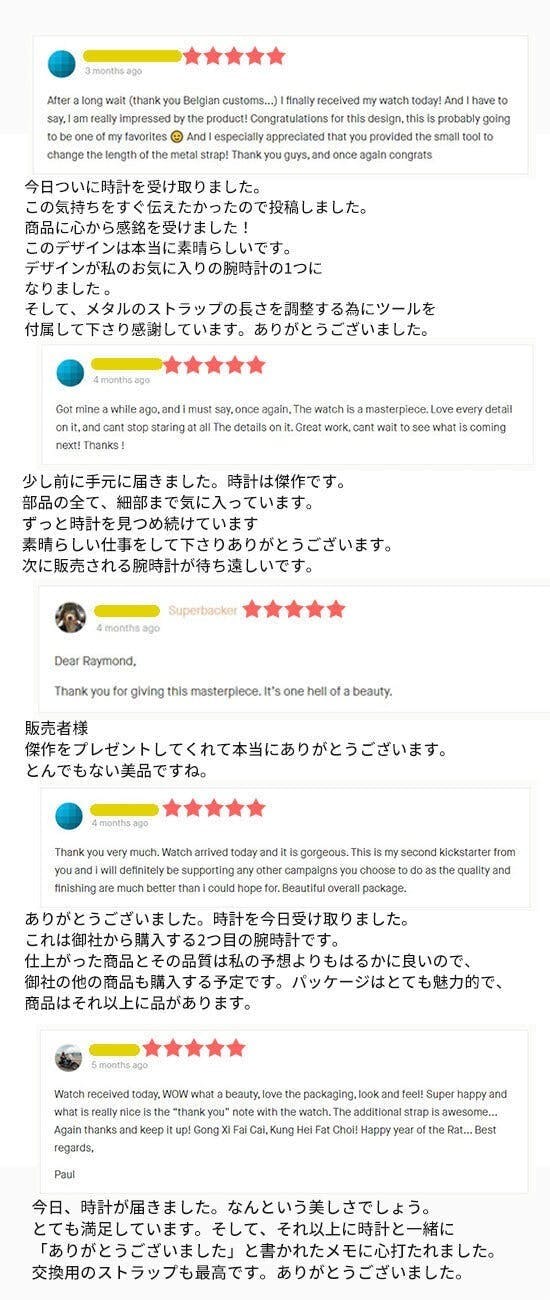 2021/08/02 11:19ご覧いただきありがとうございます。https://camp-fire.jp/projects/view/409192商品が届き、最終検査が終わりましたので本日・明日で商品を発送します。【クラウドファンディング購入者限定!】商品購入者の方限定で、公式ネットショップの購入いただいた時計の該当する型番のページ下部にある「レビューを書く」より評価を書いていただいたお客様【全員】に①保証期間を2年から2年半に延長②バリモアのブレスレットを無料プレゼントします!商品評価を書いた後で公式LINEより教えて下さい。宜しくお願いします。ネットショップ(購入していただいた時計をクリックして評価を書いて下さいね)https://valimor-japan.com/collections/valknut公式LINEhttps://bit.ly/2QnFdu1お届けまでもうしばらくお待ち下さい! もっと見る【ご住所の確認につきまして】商品を海外から発送しました!