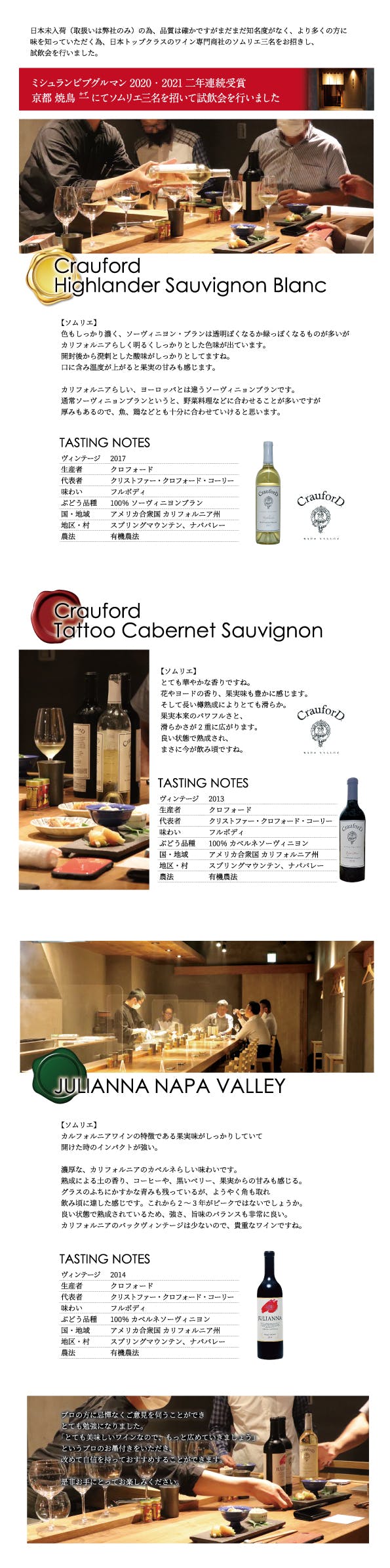 2021/08/17 14:00日本でのお取り扱いは当社だけのCrauforDの「Highlander」白ワインのご紹介です。今回のワインの良さがなかなか伝わらず、歯がゆい思いもあります。日本未入荷(取扱いは弊社のみ)の為、品質は確かですがまだまだ知名度がなく、より多くの方に味を知っていただく為、日本トップクラスのワイン専門商社のソムリエ3名をお招きし、試飲会を行いました。【ソムリエさんの感想/Highlander 】 色もしっかり濃く、ソーヴィニヨン・ブランは透明ぽくなるか緑っぽくなるものが多いがカリフォルニアらしく明るくしっかりとした色味が出ています。開封後から溌剌とした酸味がしっかりとしてますね。口に含み温度が上がると果実の甘みも感じます。カリフォルニアらしい、ヨーロッパとは違うソーヴィニョンブランです。通常ソーヴィニョンブランというと、野菜料理などに合わせることが多いですが厚みもあるので、魚、鶏などとも十分に合わせていけると思います。白ワインとしても美味しいとのお言葉をいただきましたが、シャンパンの代わりになるくらいの力強さがあるそうです。 もっと見る