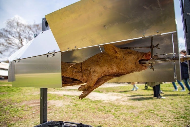 日本中に、もっとそういうBBQが広まってほしい。家族や仲間たちや恋人同士で、週末になったらいろんなところでBBQパーティが開かれるようになってほしい。そして屋外焼肉スタイルもいいけれど、せっかくなら家の外じゃないとできないことをやってほしい!『仔豚の丸焼き機』があれば、仔豚の丸焼きをはじめいろいろな料理に使えます。