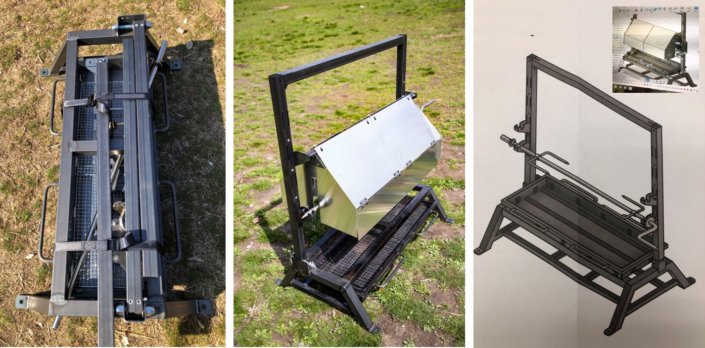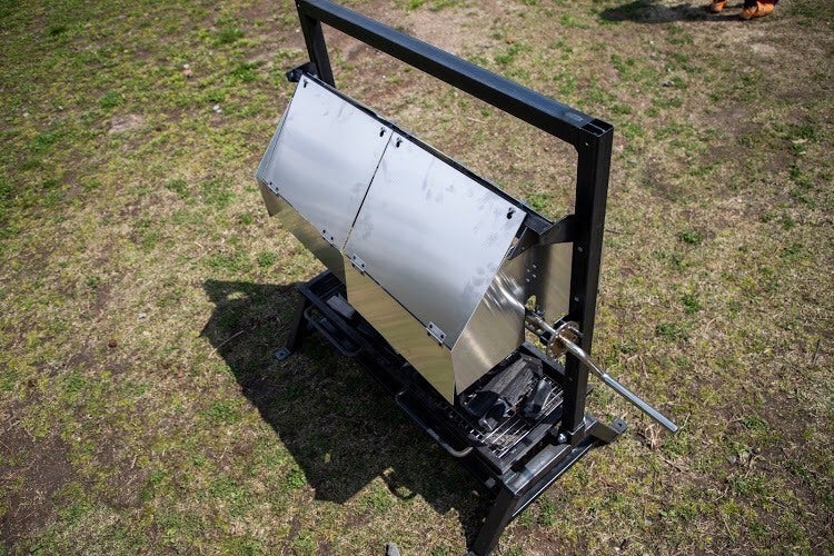 タイヤや台車のハンドルのような追加パーツを用意する予定ですので、それらをつけていただくことで、移動も楽にできるようになります。自動で串を回転させる機能は今はありませんが、今後別売りで作ることを検討しています。