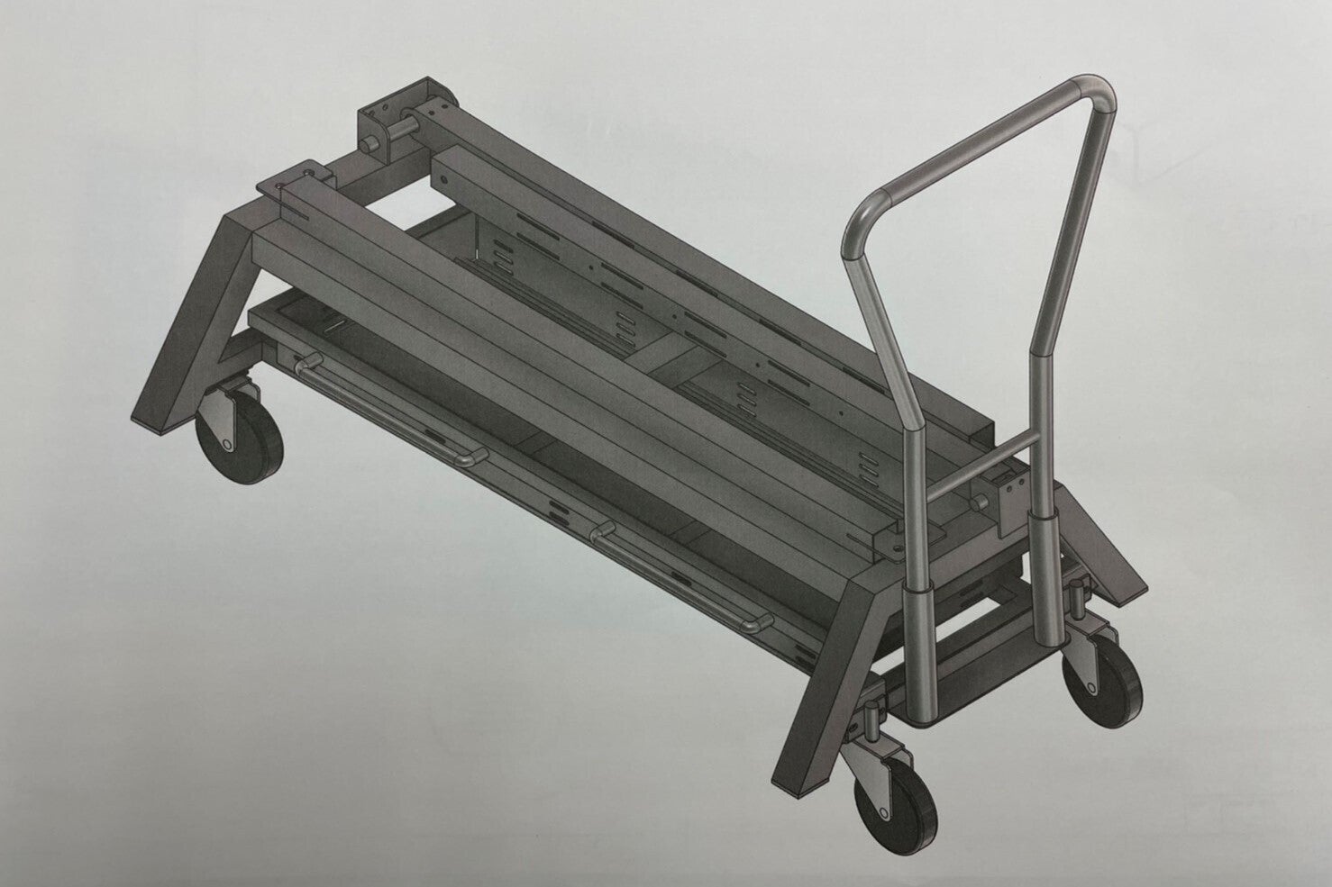 右の写真が設計図、真ん中の写真が現在の試作機です。鉄でできているので、モノとしてはかなりの重量があり、組み立てた状態では大きさもありますが、左の写真のようにばらしてコンパクトにまとめることも可能です。
