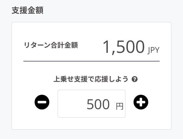 プラスで支援したい金額を入力して下さい。この場合は1000円のリターンを選択し、500円の上乗せ支援をしているので合計金額が1500円と表示されています。