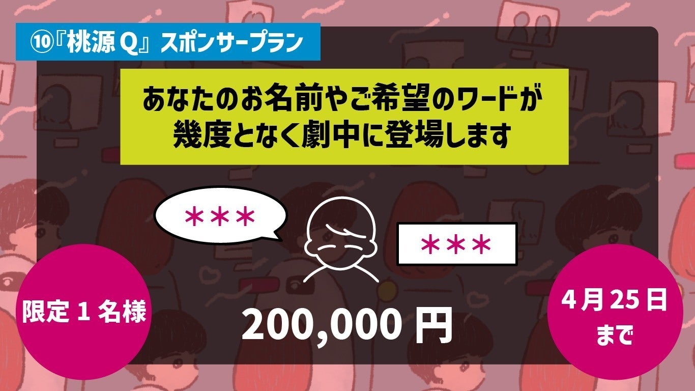 ⑩【『桃源Q』スポンサープラン|お名前やご希望のワードが劇中に幾度となく登場|¥200,000】※こちらのプランは先着1名様限定~4/25まで!