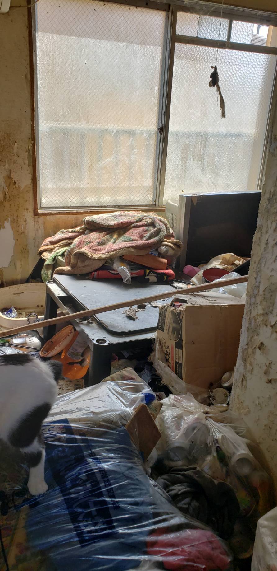 ・多頭飼育崩壊レスキュー…4/6にSOSがありレスキューに向かいました。4畳1間の家に5匹の猫。ふん尿とゴミ山の中で助けを求めるかの様に泣き叫んでいました。1週間以上飼い主さんは帰っておらず水も餌もありません。早急に保護し病院受診をしたところ、軽い脱水やカリシウイルス(猫風邪)、結膜炎にかかっており現在治療中です。