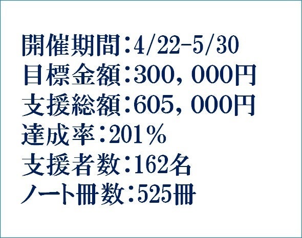 この度は、「すんなり瞑想ができる、そんなノートを作りたい!」にご支援をいただき、誠にありがとうございました。本企画は、下記のような結果となりました。