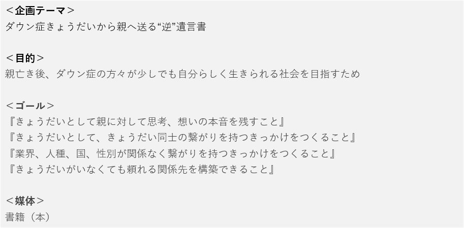 きょうだいとしての本音、親への想いを綴り、ダウン症本人、きょうだい、ダウン症に今まで関わったことがなかった方々が世界中で繋がるきっかけをつくり、「個人が尊重される時代」において、国や業界、人種が隔てなく繋がることで親御さんが亡くなった後の世界でもダウン症という存在が輝き続けるようにしたいと本気で想っております。