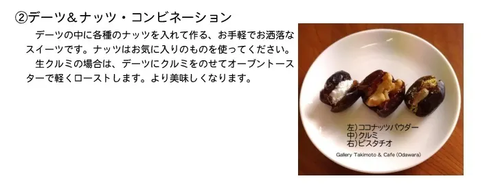 マザファティ・デーツとナッツのコンビネーションです。これは、意外と簡単にお洒落なスウィーツとなります。デーツは、単体でお召し上がりになっても美味しいのですが、他のナッツとの相性がとても良いです。どうぞ、お試しください。