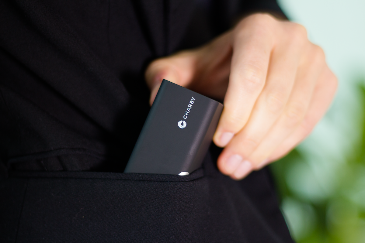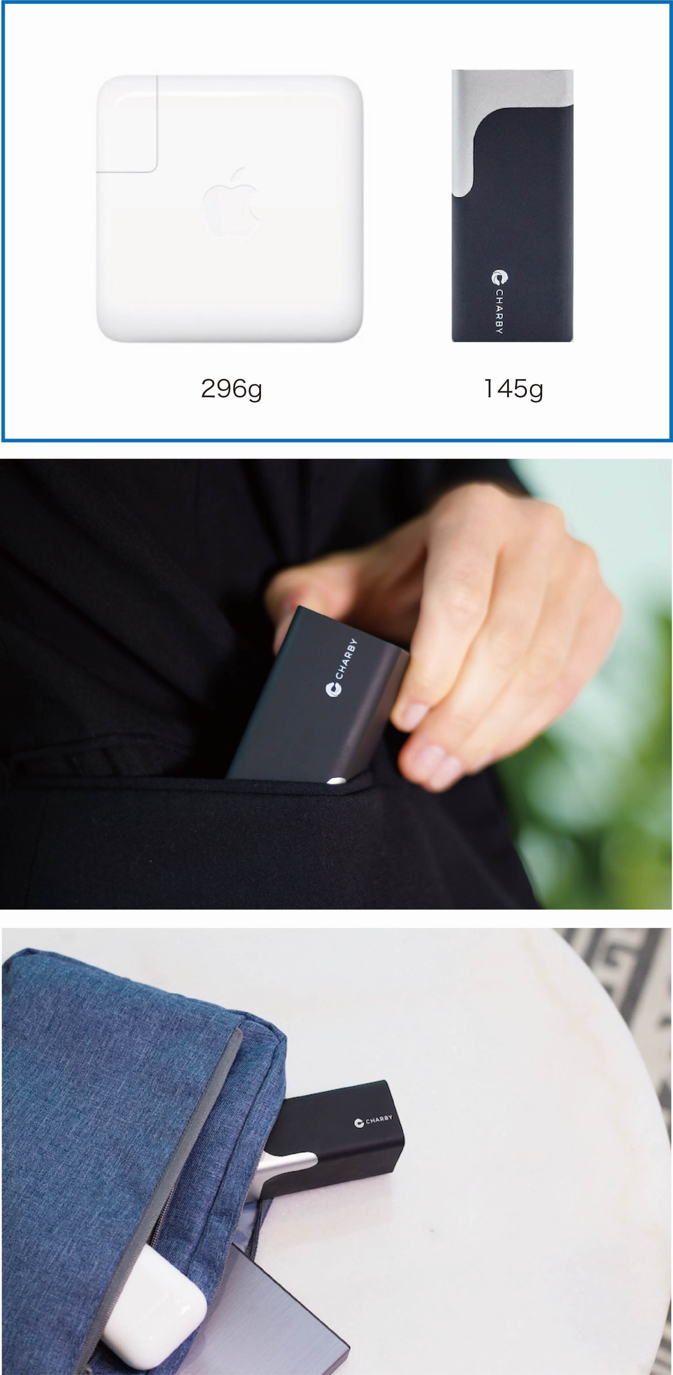 【Charby Pico】のサイズは76×39×34mm、重さは僅か145gの軽量コンパクトさなので、ポケットやバッグの隅に入れておくだけで、どこでも充電ができます。
