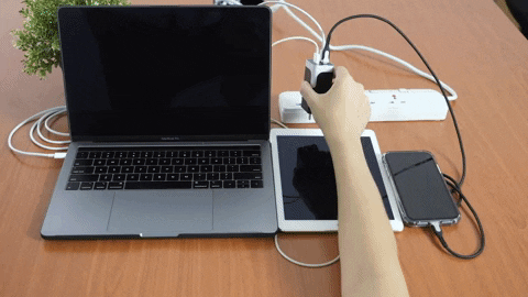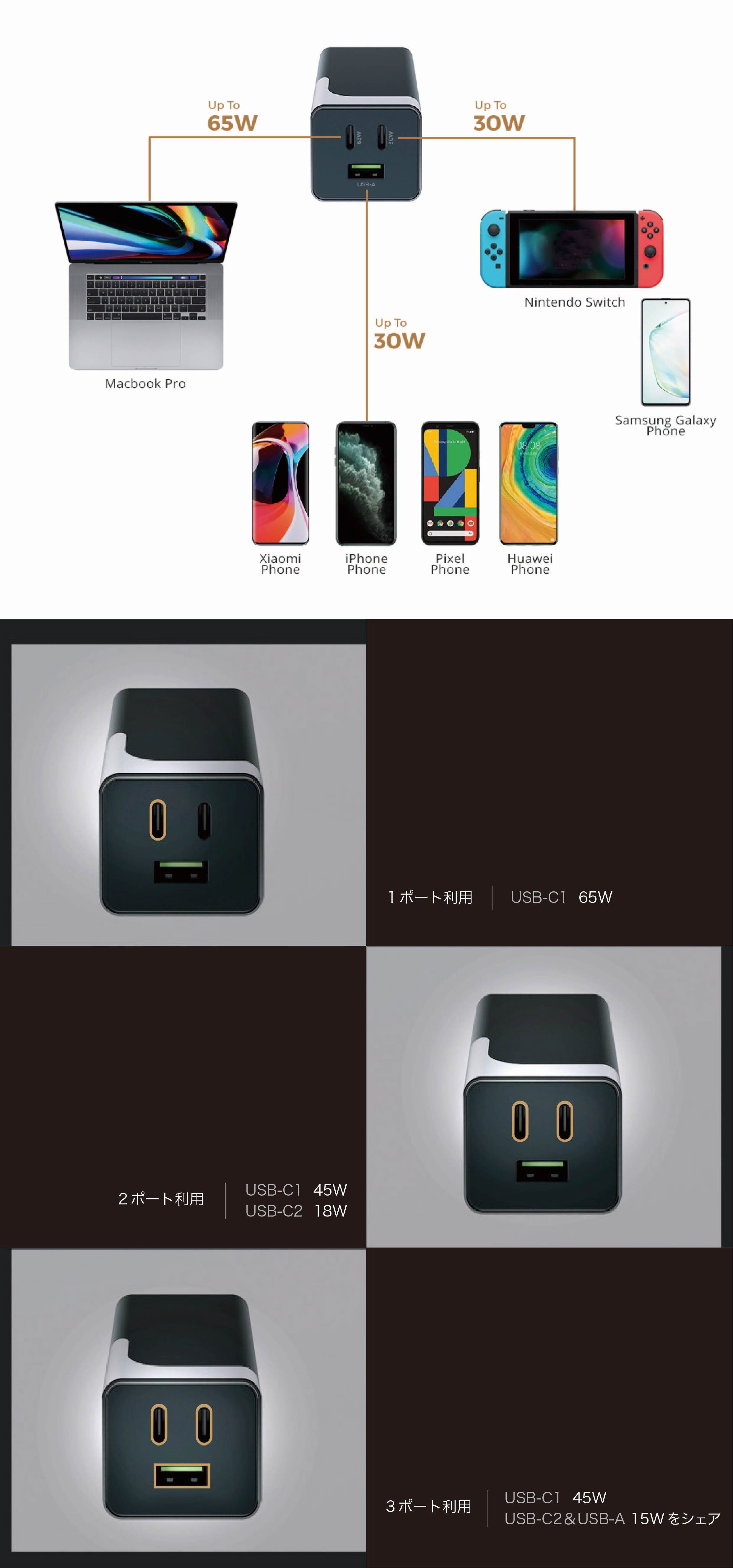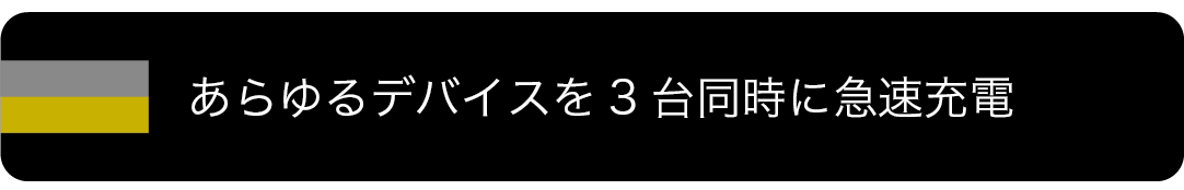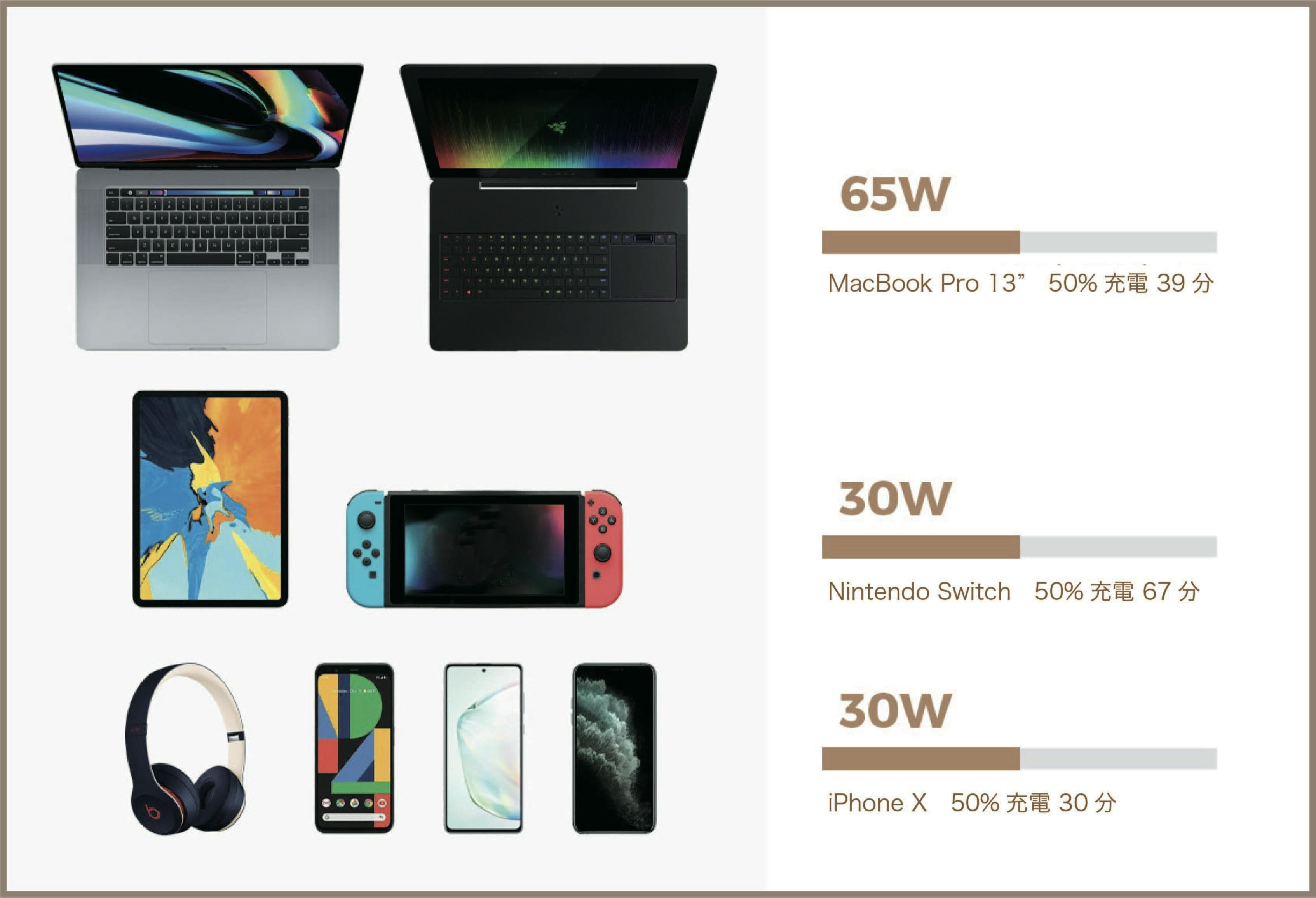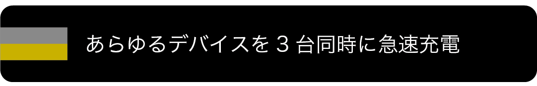 ノートPC、スマートフォン、タブレット、ゲーム機、カメラ、ヘッドフォンなど、あらゆるデバイスを充電できます。また、3台のデバイスを同時に繋いで、ノートPCで作業している間にスマートフォンとタブレットを充電するというような使い方も可能です。