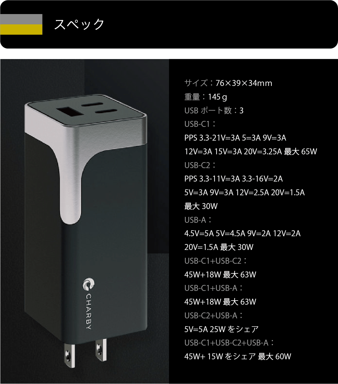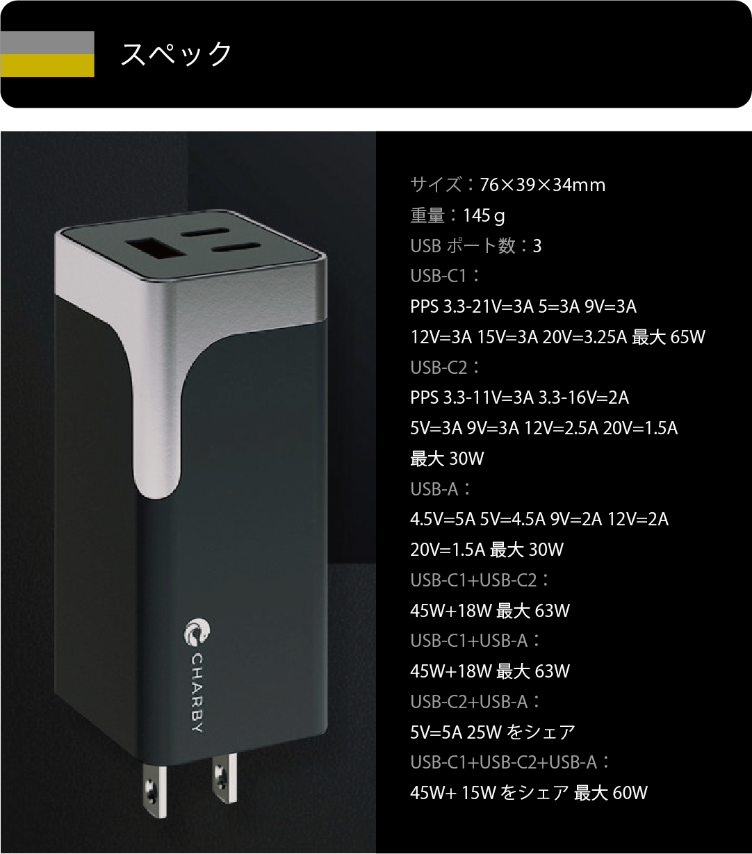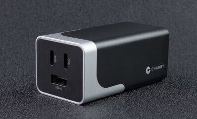 【Charby Pico】はUSB-Cを2つ、USB-A1つと計3つのポートを備えていますので、PCやタブレット、スマホのチャージャーをそれぞれ持ち歩く必要がありません。最大出力はUSB-Cが65W、USB-Aが30Wです。