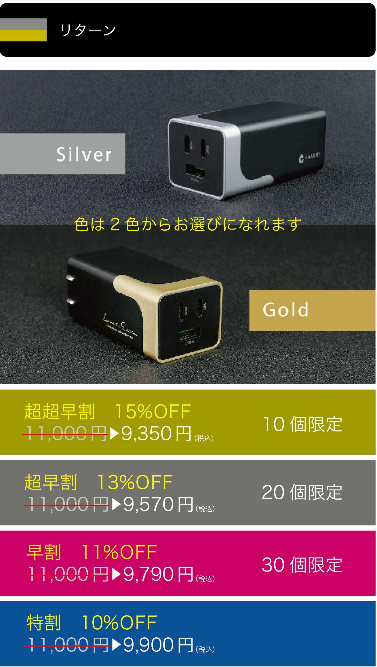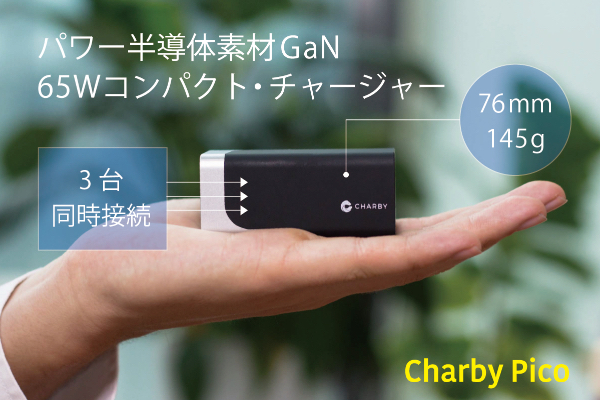 【Charby Pico】はこのGaNを利用することで、従来の充電器に比べはるかに小さいサイズと充電速度を実現しました。