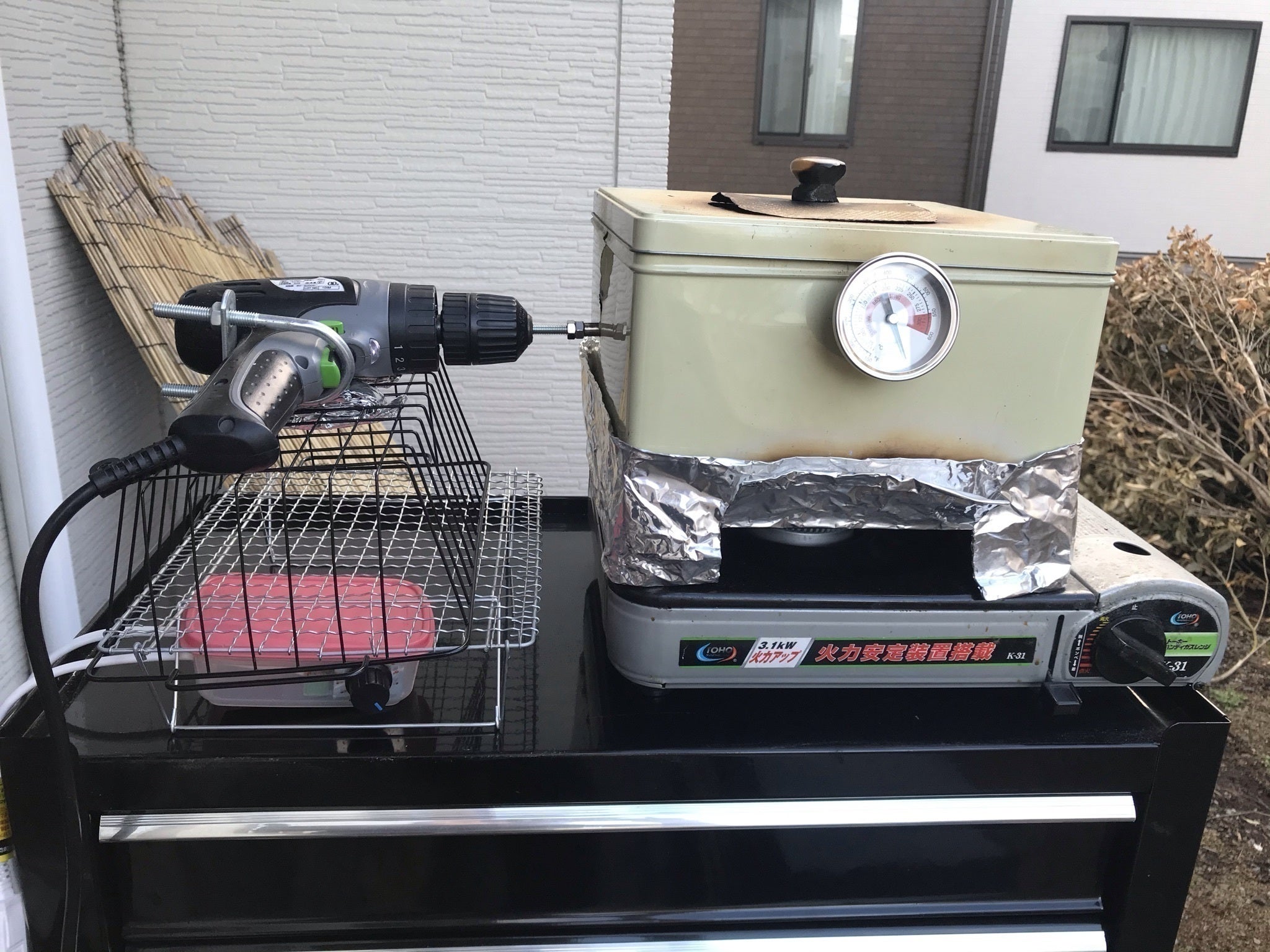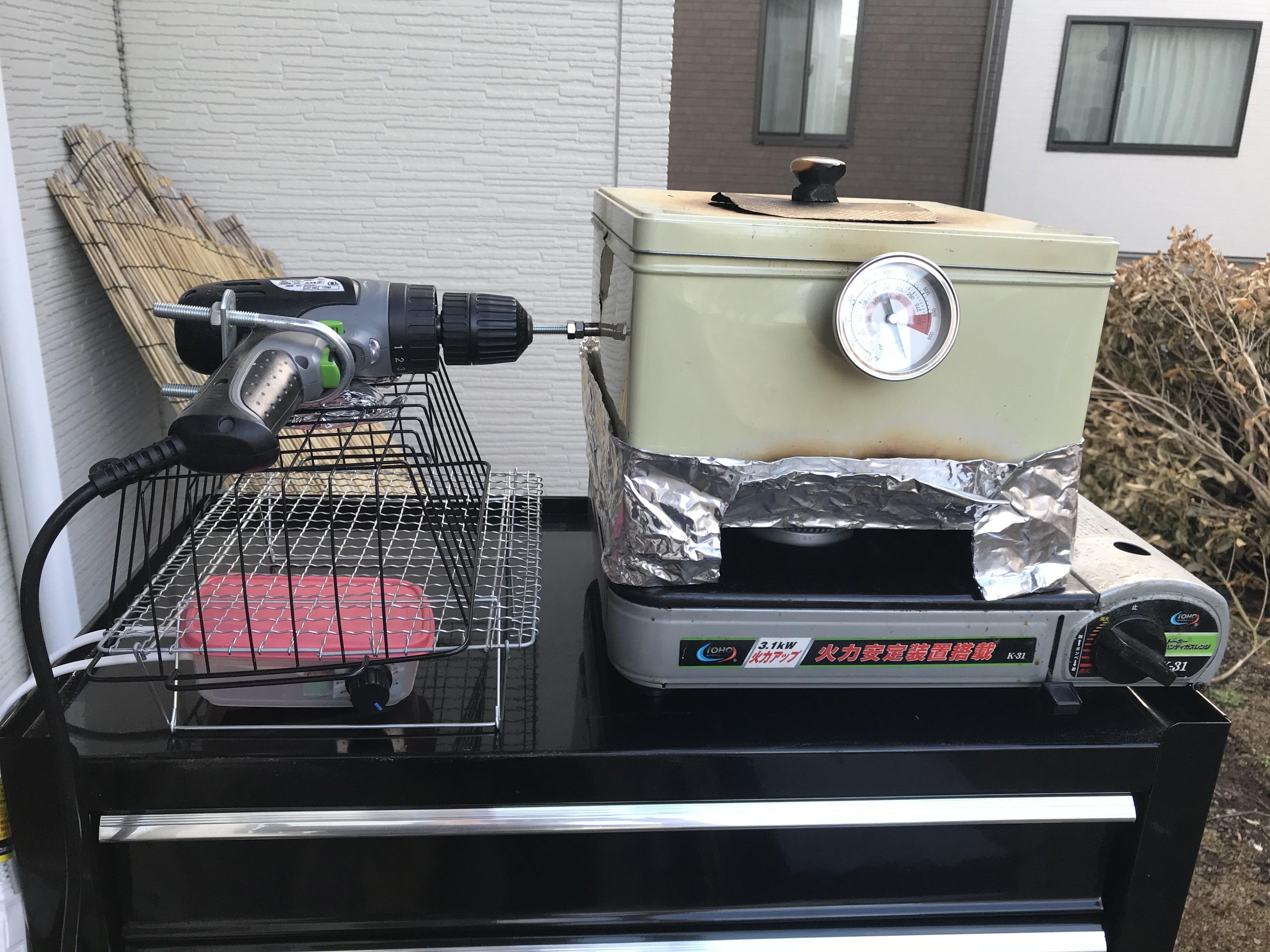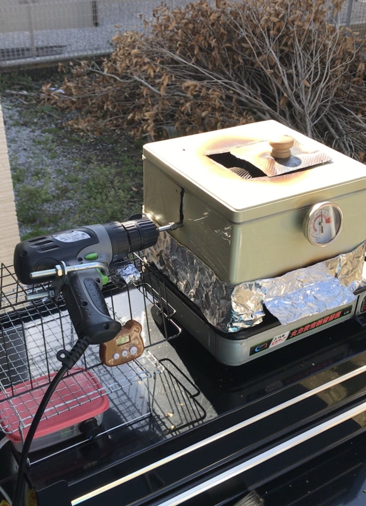 ボディ部はよくある煎餅缶、中に回転するドラムを入れ、電動ドリルで回す。これを家庭にあるカセットコンロにセットしてコーヒーを直火焙煎します!