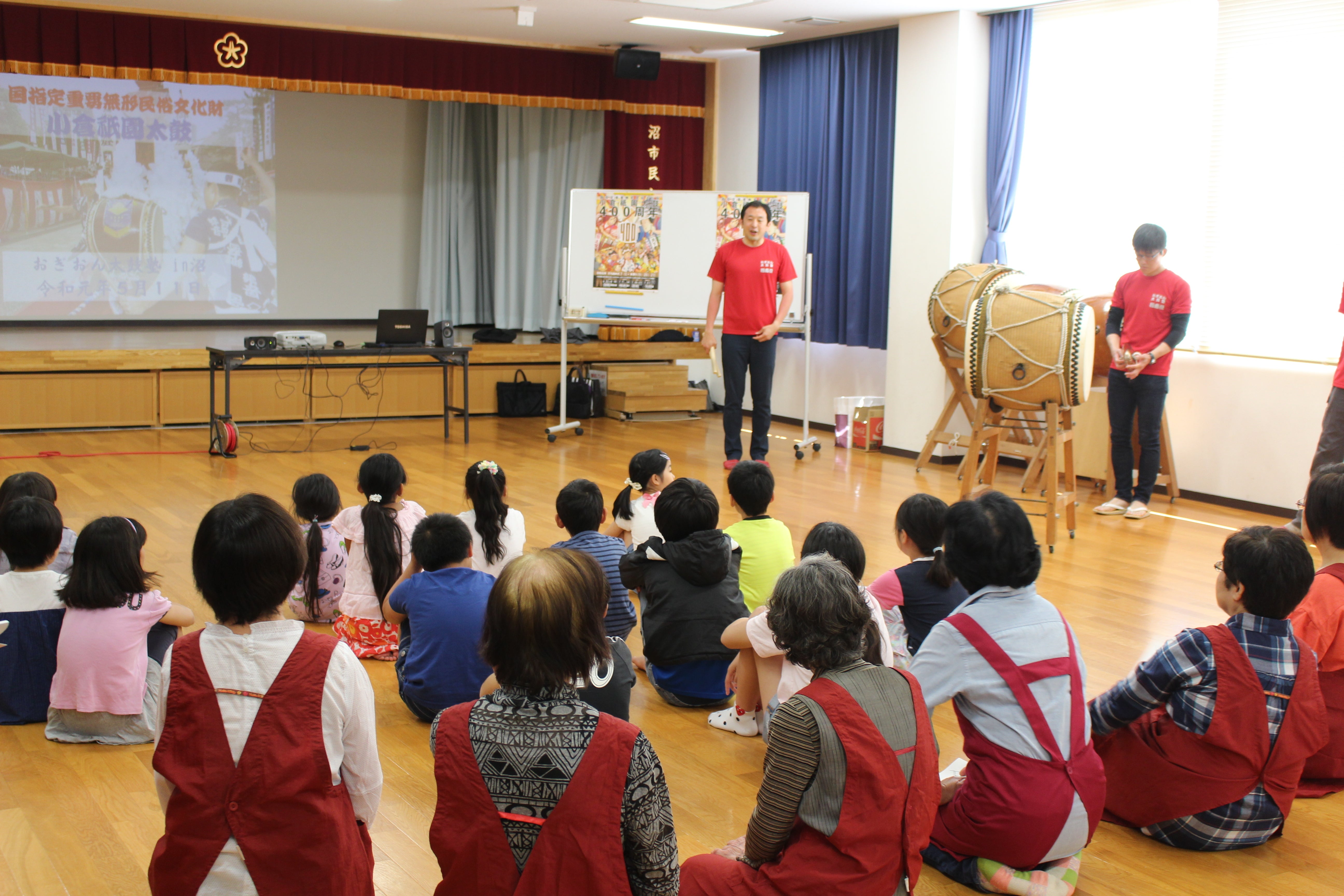 400周年行事の一環としてスタートしたのが、「おぎおん太鼓塾」です。「おぎおん太鼓塾」は、地元には住んでいるけれど、祭りを体験したことがない子どもたちに向けて、祭りの魅力や太鼓の楽しさを伝える活動で、2020年2月までの約半年の間に市内15ヵ所で開催しました。