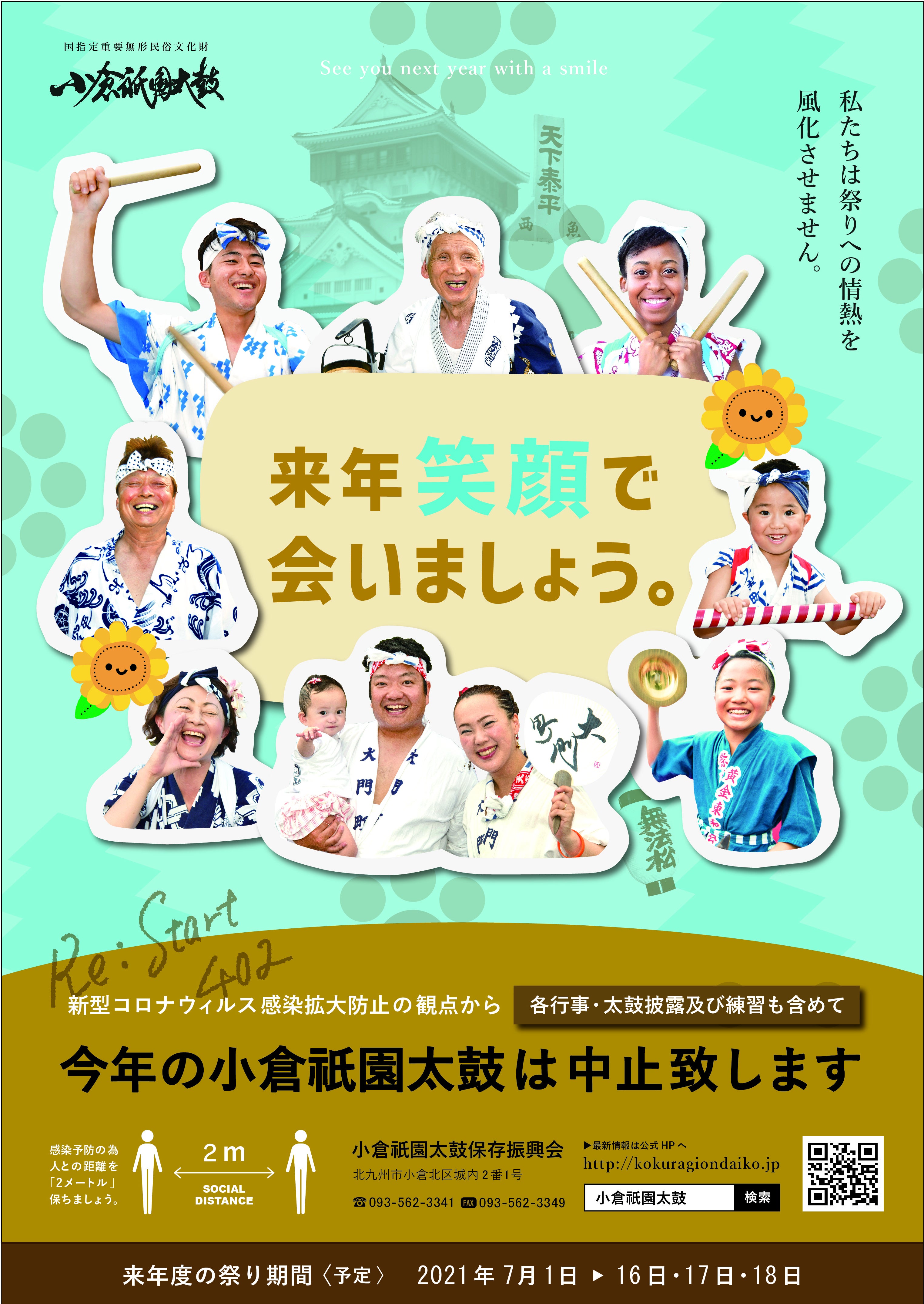 2021/06/02 16:55小倉祇園太鼓保存振興会では、伝統文化の伝承の歩みを止めないため、代替行事を含めた実施の可能性について探ってまいりましたが、本祭り(7/16~18)の開催まで2ヶ月を切った5月末時点の新型コロナウイルスの感染状況を鑑み、本祭りに関わる行事の中止を決定いたしました。小倉祇園太鼓を愛してくださる皆様には大変つらいお知らせとなりましたが、今後は、福岡県内に発出中の緊急事態宣言の解除されてからではございますが、保存振興会が作成した感染防止ガイドラインを基に、太鼓練習や次世代育成のための太鼓塾等の再開を目指してまいります。今後とも、小倉祇園太鼓を引き続きご愛顧くださいますようお願い申し上げます。また、太鼓塾の定期的な開催のためにも温かいご支援のほどよろしくお願いいたします。令和3年6月小倉祇園太鼓保存振興会 もっと見る