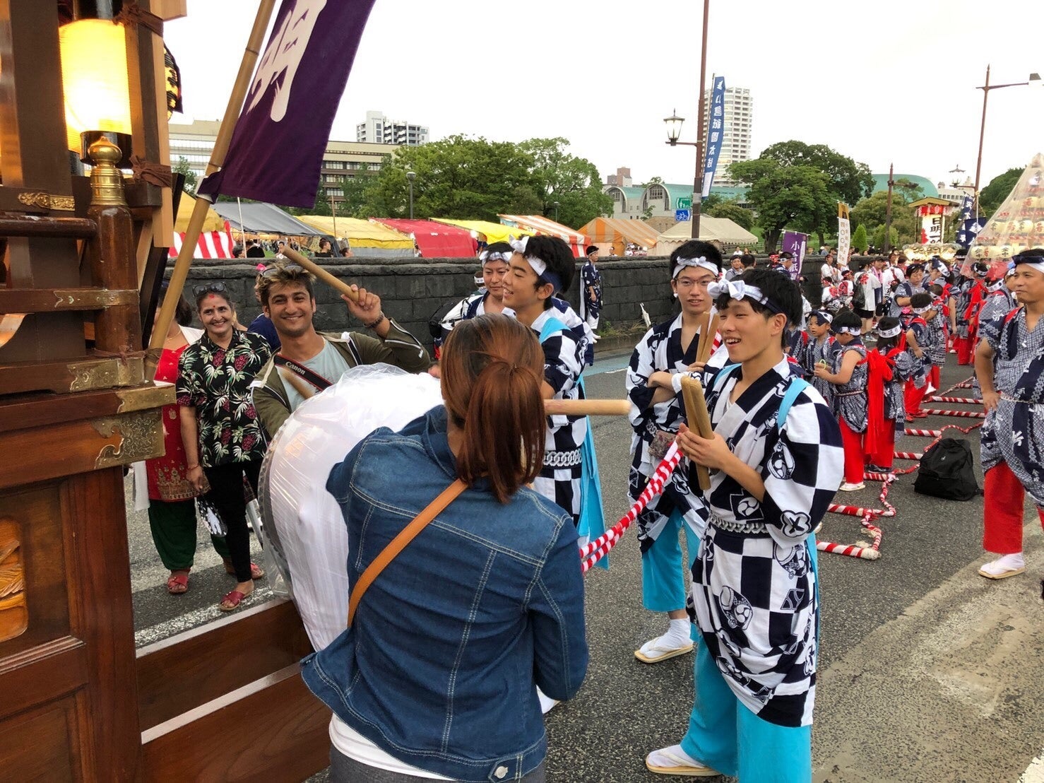 将来の祭り参加者育成のきっかけにと、祭りを体験したことのないかた向けに、実際に競演大会が行われる小倉城歴史の道で「体験山車」を運行しました。(2019年7月開催)