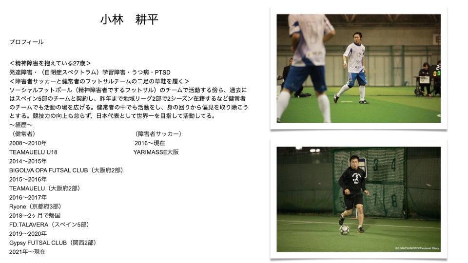 普段は特例子会社で働きながら2つのフットサルチーム(健常者チーム、障害者チーム)に所属しプレーをしています。