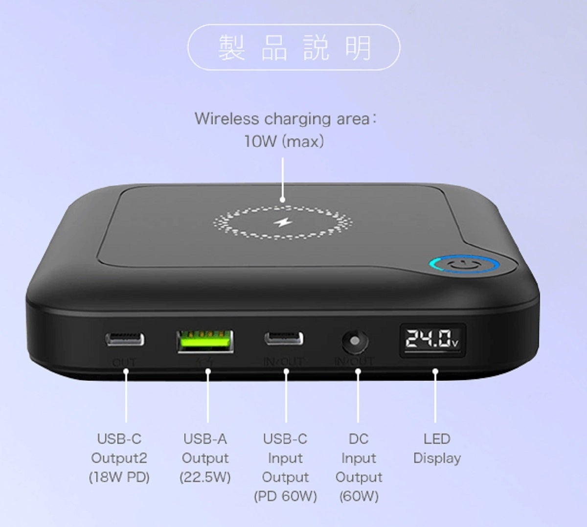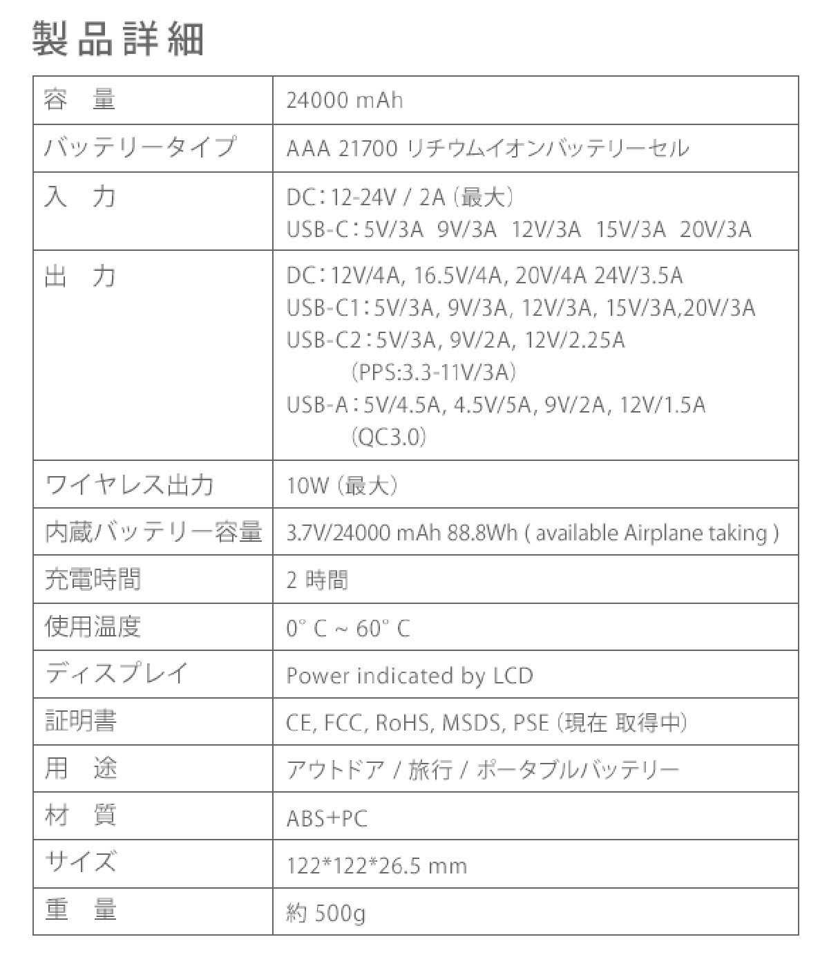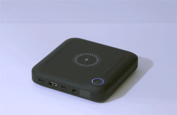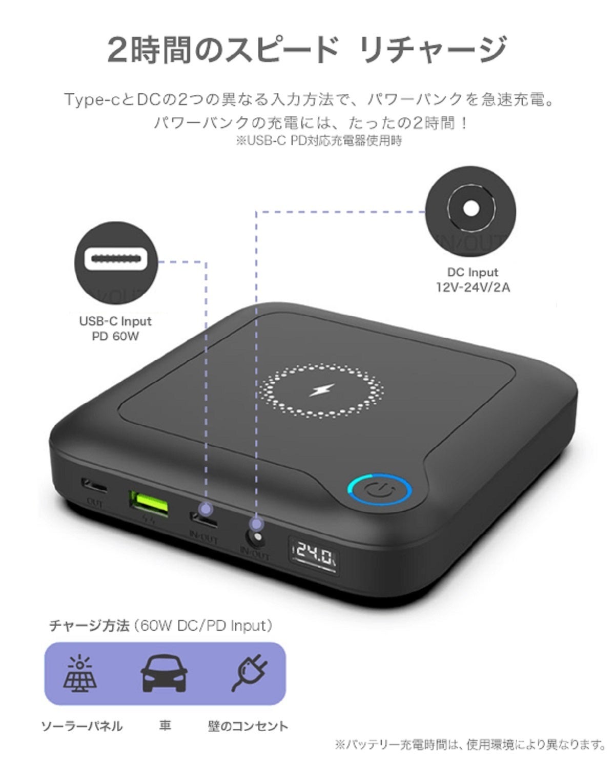 PD60W出力対応の充電器を使えば、最速おおよそ2時間でパワーバンクの充電が可能です。付属のUSB-A--USB-Cケーブルを使い充電する事もできます。その場合は急速充電ではありません。またDC入力端子へ汎用AC充電器を使い、充電する事もできます。(例: DC12V/2A出力の充電器)