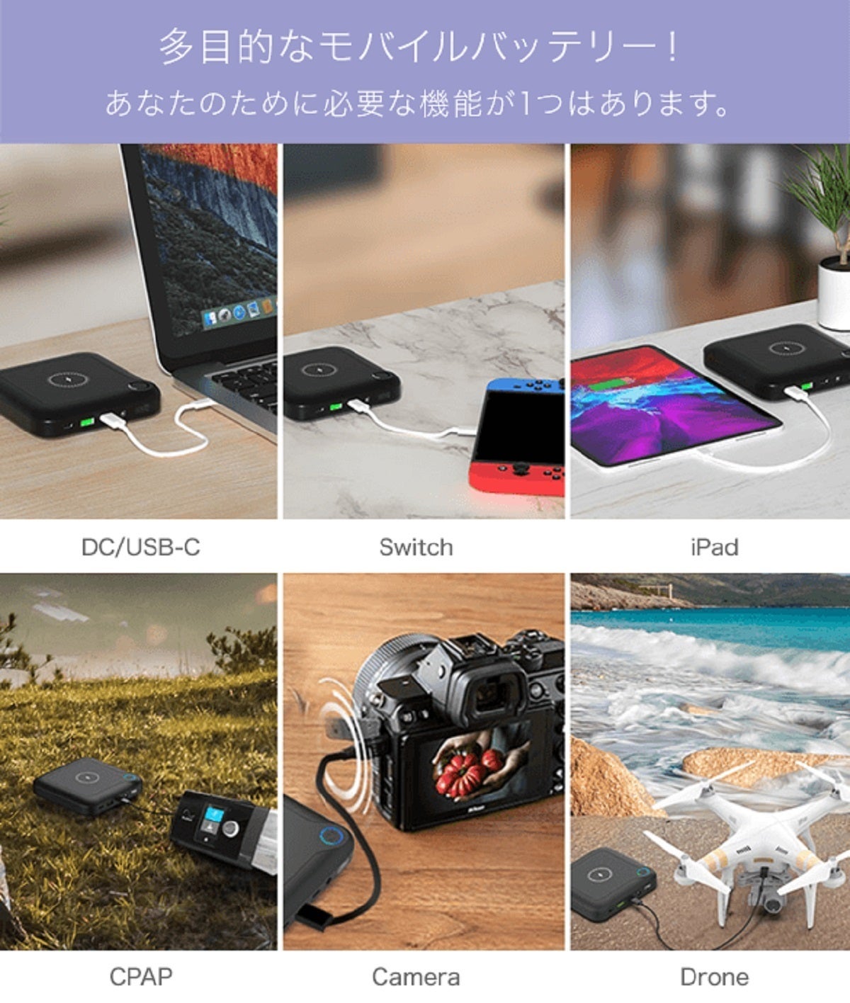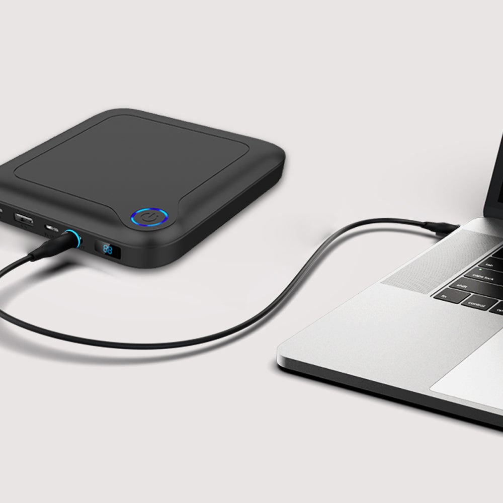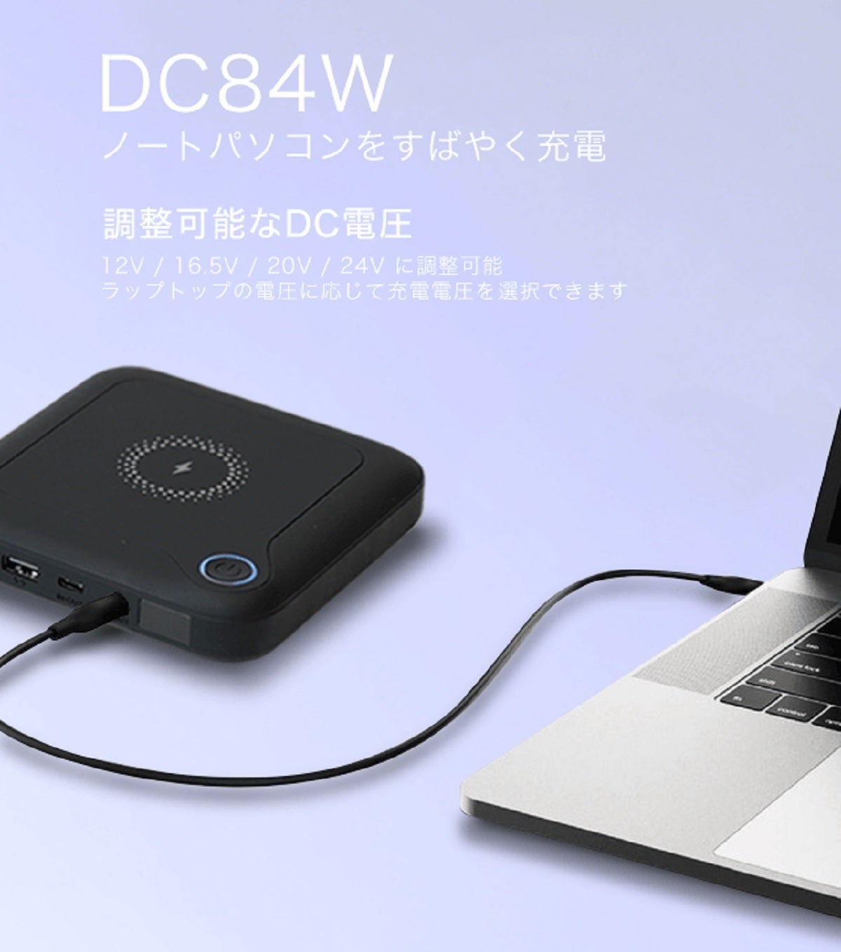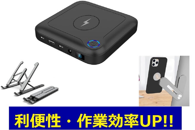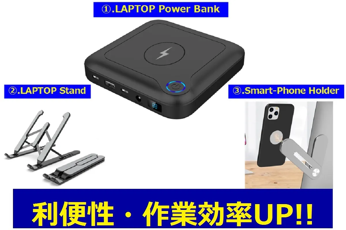 まずセットの中心となるラップトップへ電源を供給するパワーバンクです。Mac、Windows 両種類PCへ給電可能で容量は24,000mAh。ACコンセントの無い場所でも作業が可能になり場所を選ばない真のテレワークを実現できます。USB-C端子よりPD60Wを出力する事で、MacBookへの給電が可能。またDC出力端子から84Wを出力する事で、Windows ノートPC、Laptopへの電源供給ができます。